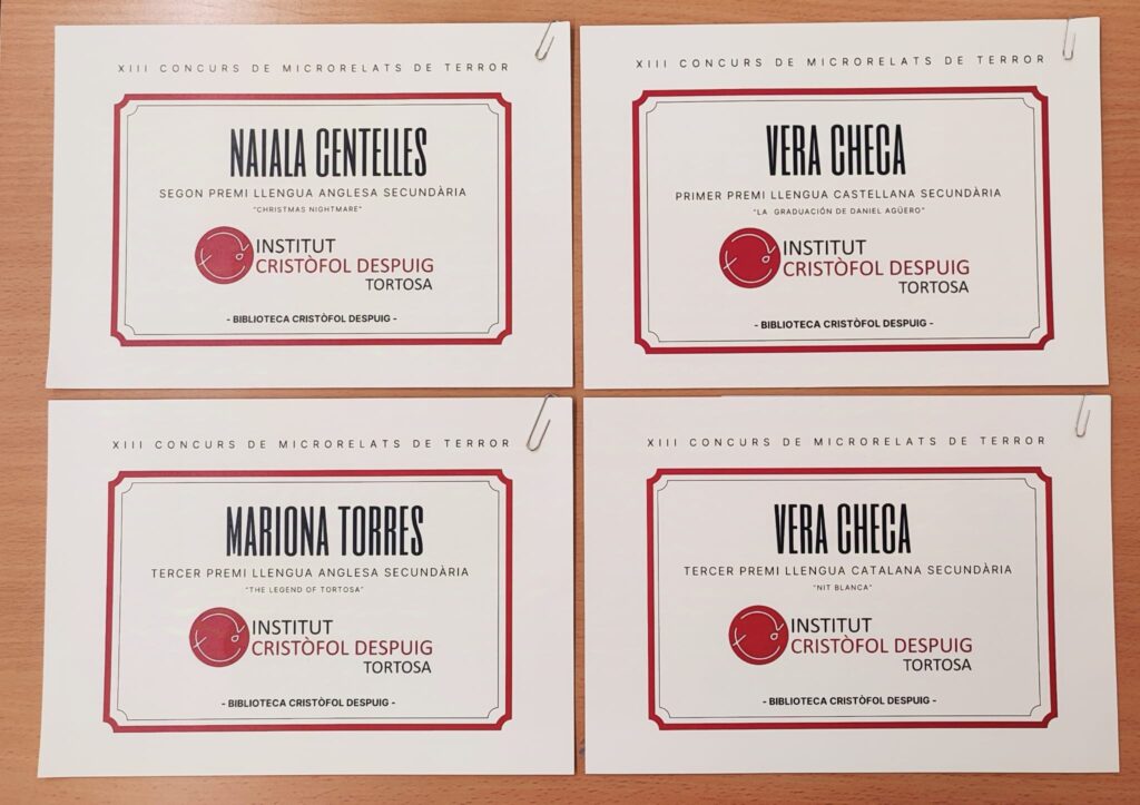 Tres alumnes de 2n Batx E han estat premiades al concurs de microrelats de terror que organitza l’Institut Despuig per a tots els centres de secundària de les Terres de l’Ebre. Concretament, les guardonades són: