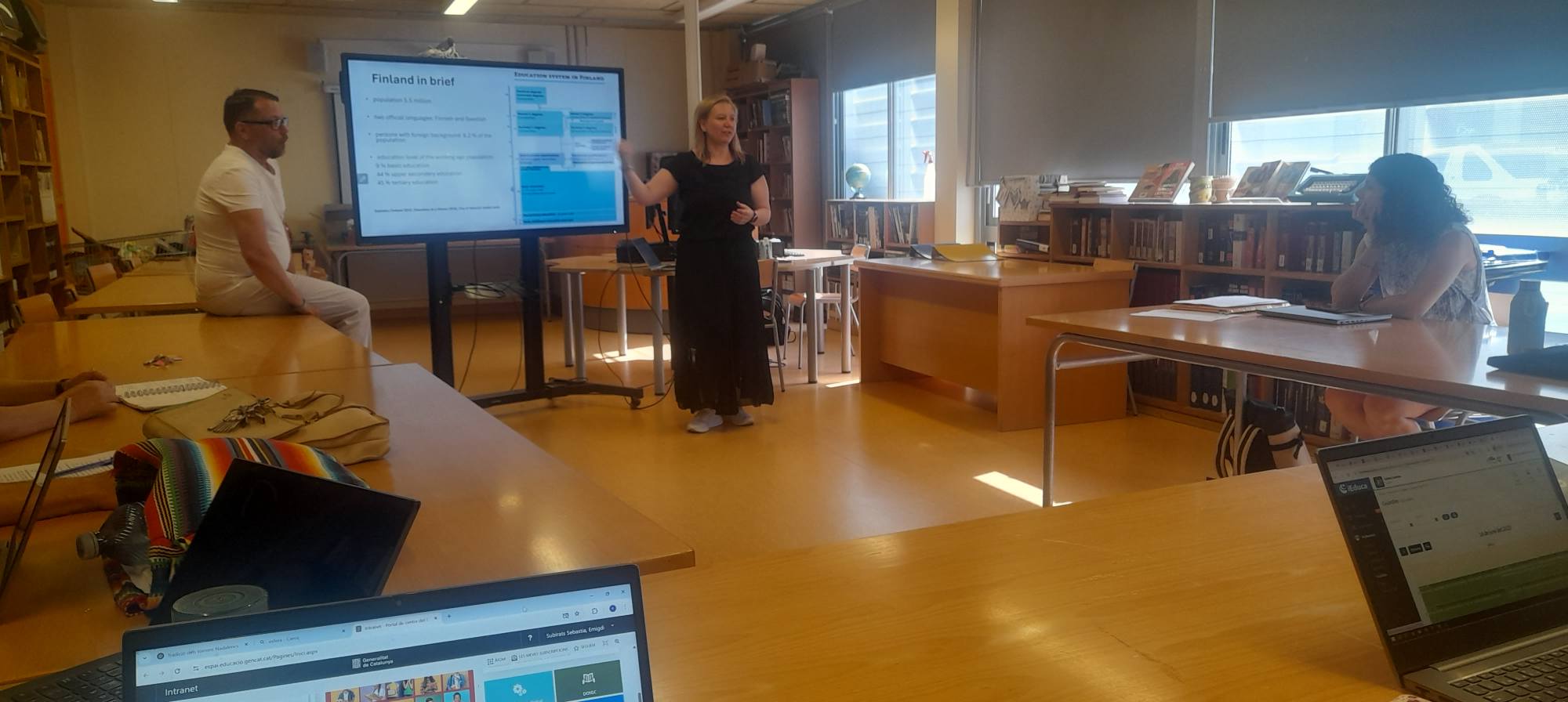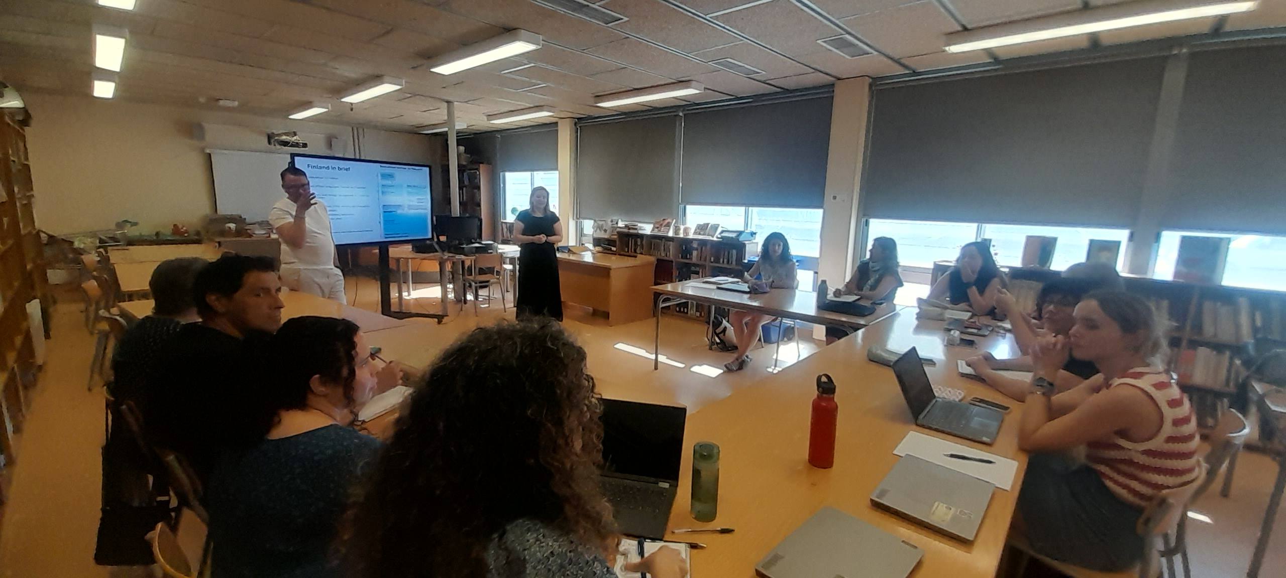 The session began with an overview of the differences between the Finnish and Catalan educational systems. One of the most notable differences is that in Finland, compulsory schooling starts at the age of 7, which is later than in Catalonia. Additionally, it was highlighted that vocational training and academic high school (baccalaureate) are considered equivalent pathways to access university. Students can even pursue both paths if they wish to do so.