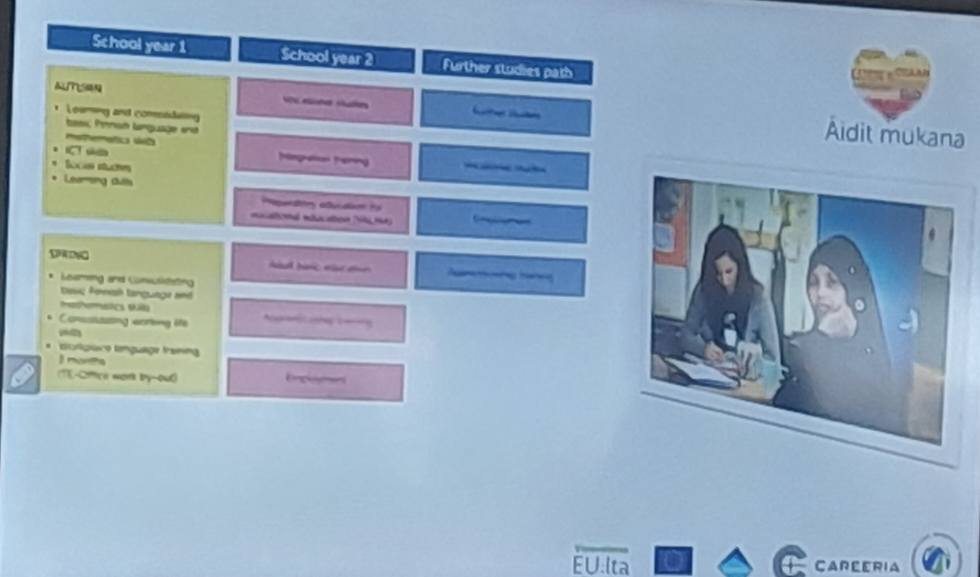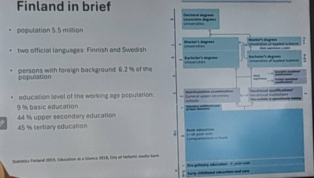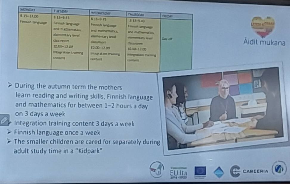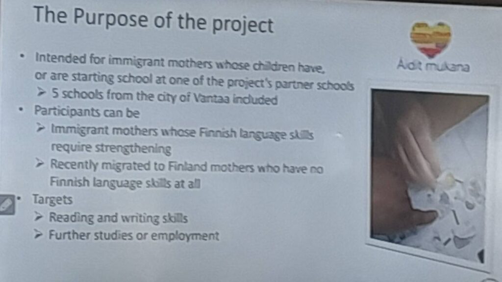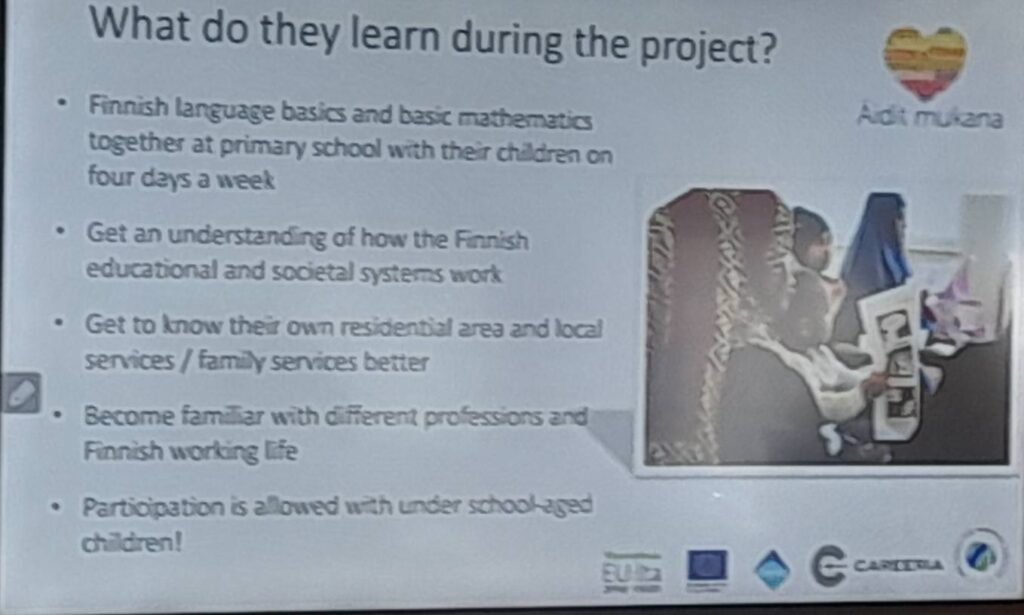 The presentation continued with the description of an innovative project aimed at immigrant mothers, Turn mothers. This programme focuses on supporting their social and professional integration through the learning of the Finnish language and exposure to local professions. While learning the language, the mothers become familiar with careers such as nursing and culinary arts, helping them to integrate into both educational and labour environments.