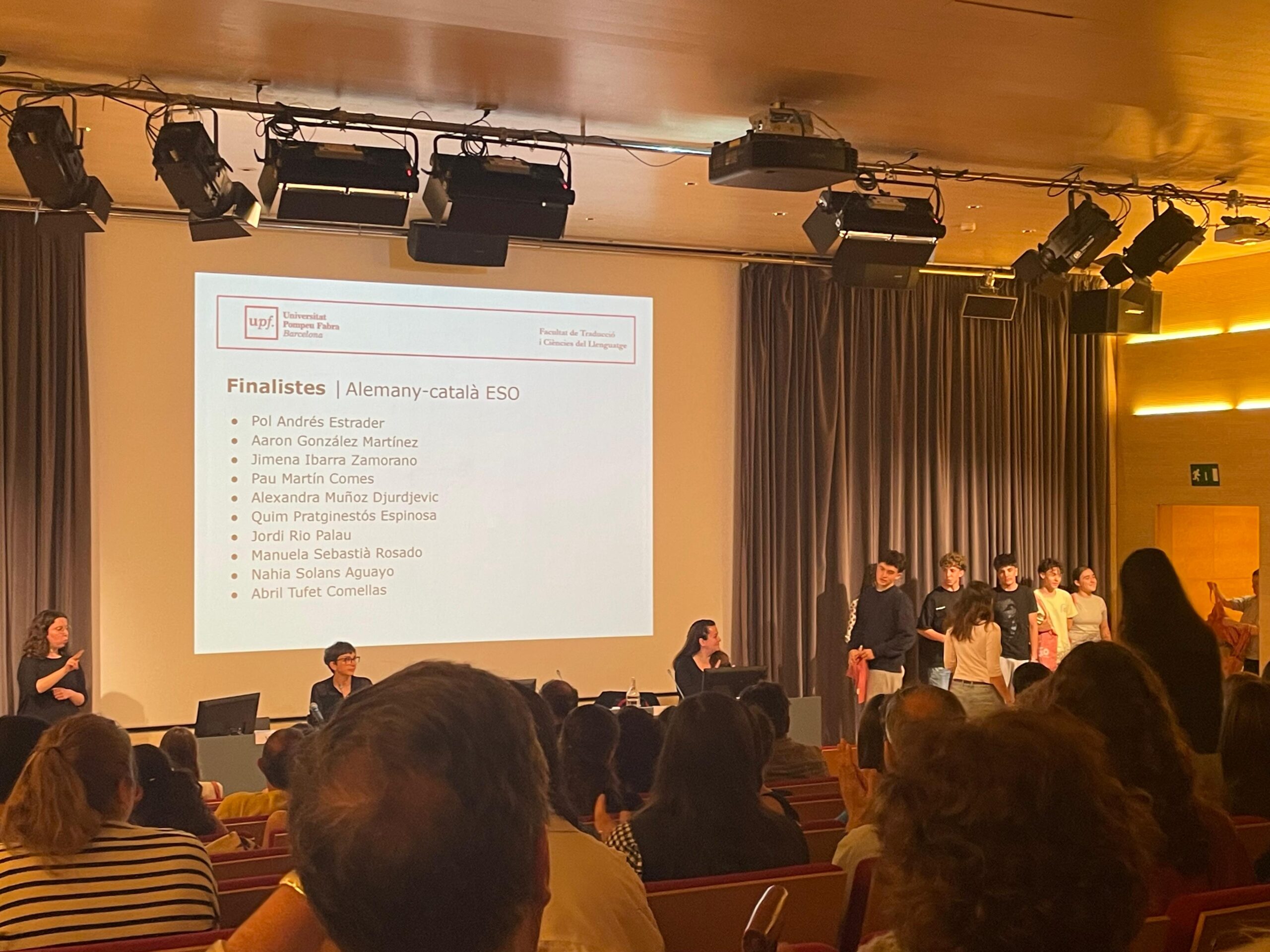 Amb 2400 candidats en competició, el fet de ser finalistes és un gran èxit per a l’ensenyament del francès i l’alemany a l’institut. L’organització del concurs va ser a càrrec de la Facultat de Traducció de la UPF, en col·laboració amb el Goethe-Institut i l’Institut Francès. A més, es van lliurar premis de treballs de recerca relacionats amb l’estudi de la llengua i també reconeixements sobre la llengua catalana de signes, una disciplina que va captivar els assistents per la manera extraordinària en què els professors la van transmetre. Una gran jornada per a la celebració del talent lingüístic i la diversitat cultural!