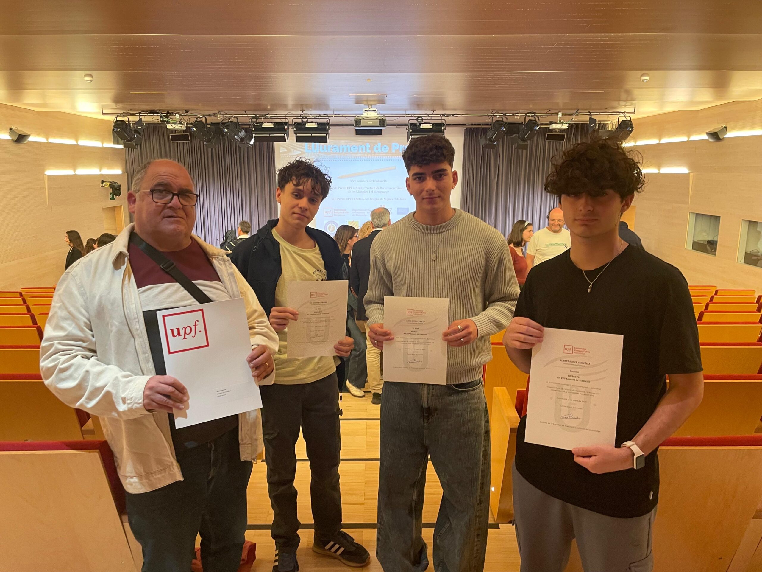 El passat 9 de maig, a l’auditori del campus del Poblenou de la Universitat Pompeu Fabra, es va celebrar l’acte de lliurament de premis del XXV Concurs de Traducció. Els alumnes Isaac Artells, de 2n de batxillerat E, finalista en la traducció de francès a català; Robert Borza, de 1r de batxillerat A, finalista en la traducció d’alemany a català; i Pol Andrés, finalista en la traducció d’alemany a català en la categoria d’ESO, van tenir l’honor d’assistir a aquest emotiu esdeveniment.