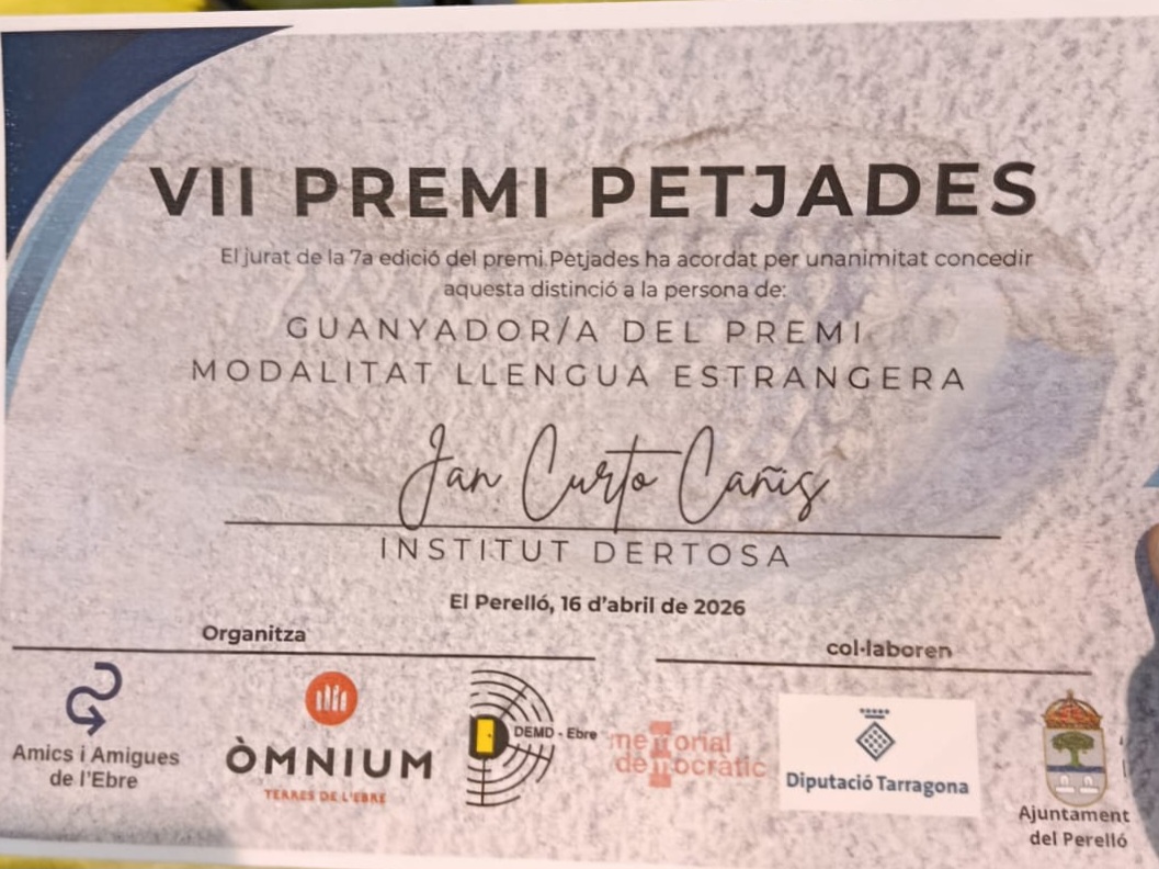 En aquest marc, l’alumne Jan Curto, de 1r de batxillerat G, va ser el guanyador de la modalitat en anglès del Premi Petjades 2026. El guardó li va ser lliurat al Perelló el dijous 16 d’abril, en un acte carregat de significat i reconeixement al talent jove.