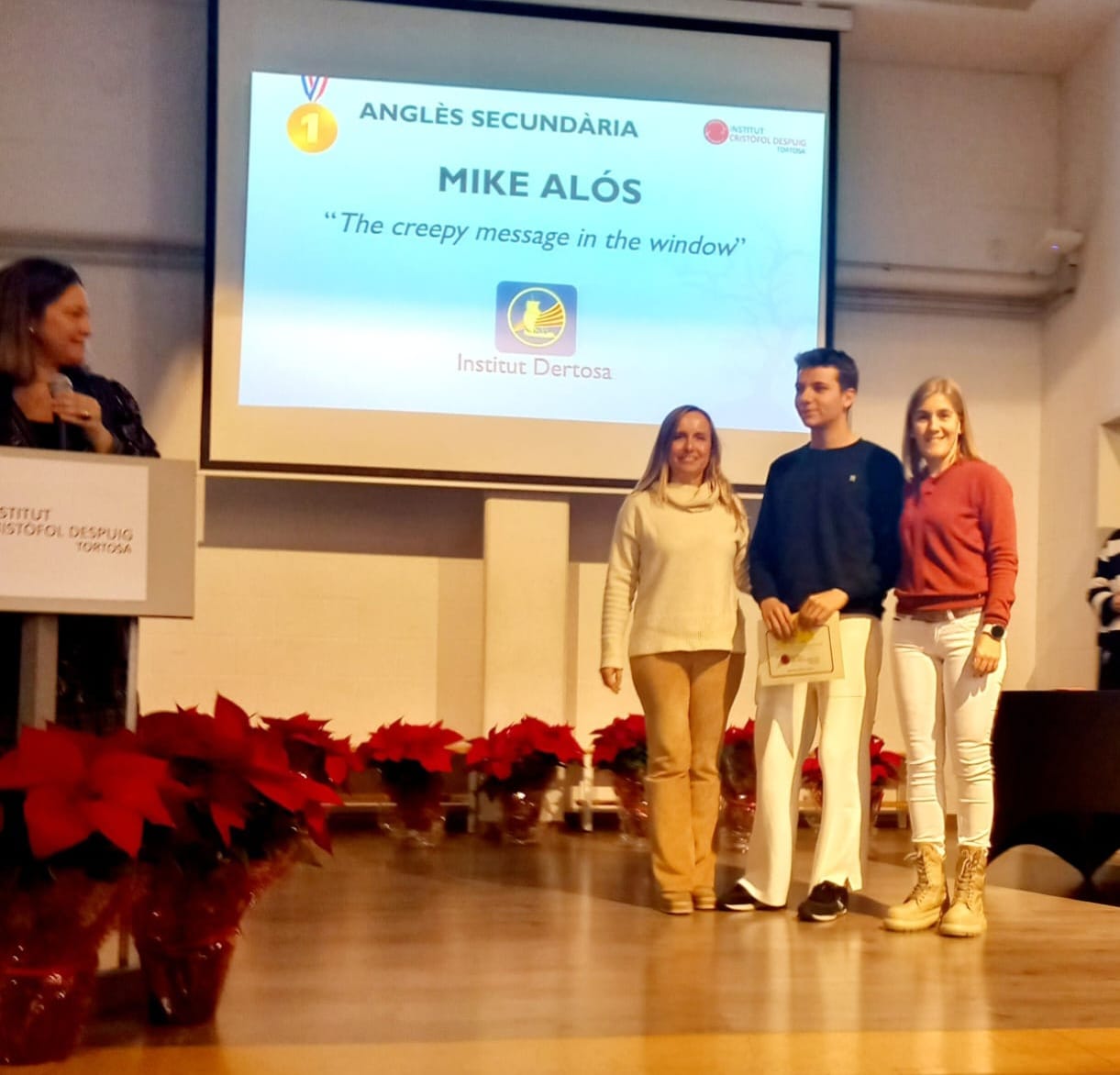 16-year-old 1st-year High School student Mike Alós was awarded in the 2023 Horror Narrative Contest, which was organised by Institut Despuig from Tortosa. The awarded tale, written in English, is entitled The creepy message in the window. The awarding ceremony took place on Tuesday 5th December at Despuig School. He was accompanied by our headmistress Francina Prades.