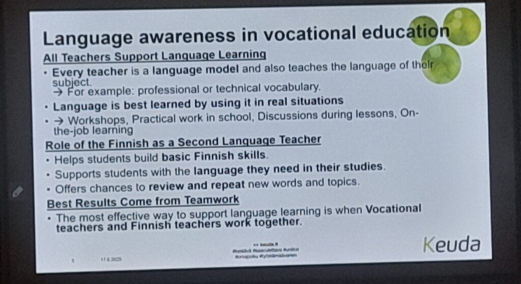 A key point of the session was the presentation of accessible teaching materials made available by the Finnish Ministry of Education. These include structured language modules, visual aids, and interactive tools tailored to different professional fields. The aim is to ensure that immigrants have practical resources to support their Finnish language learning from the very beginning.