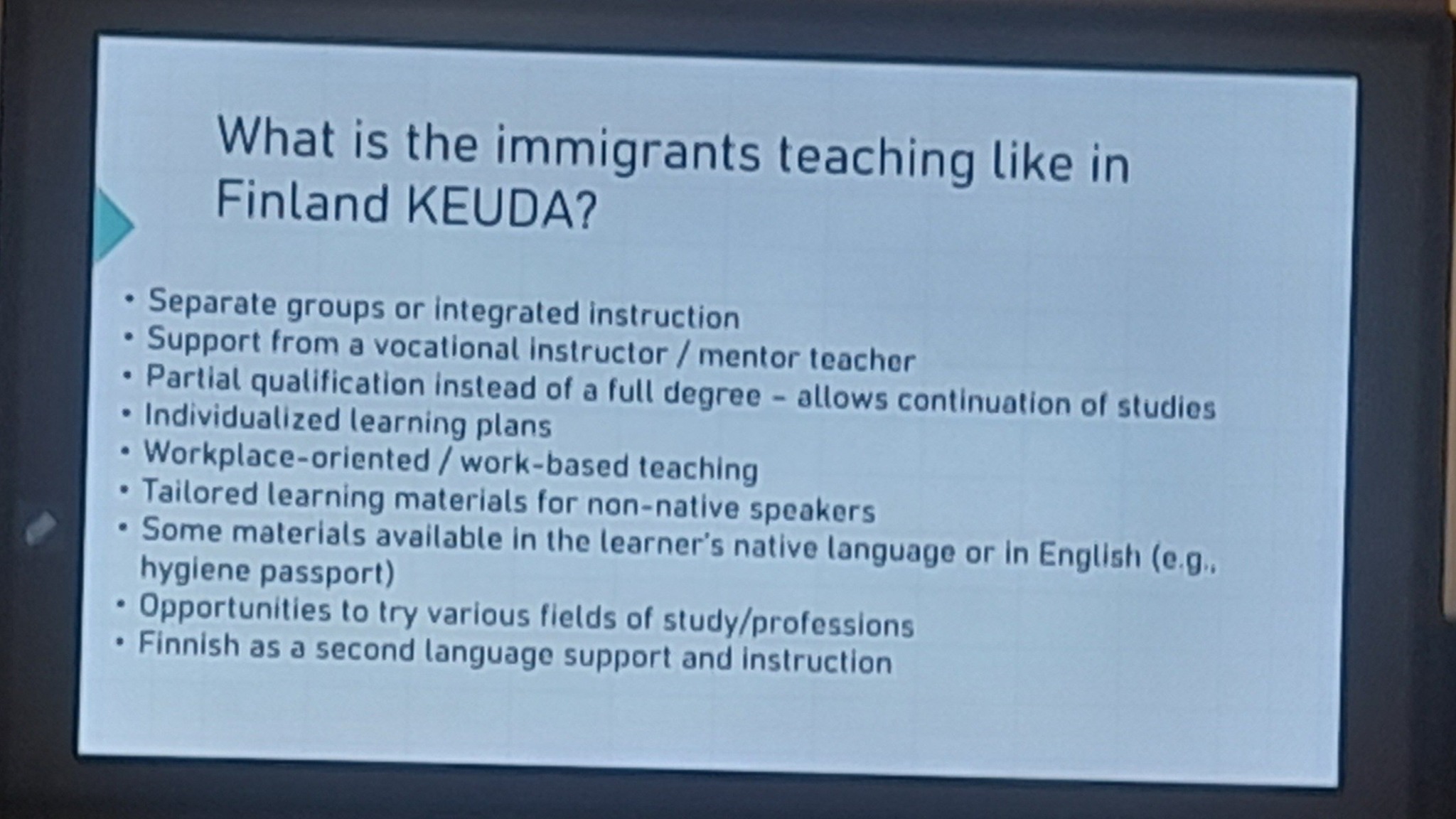 A key point of the session was the presentation of accessible teaching materials made available by the Finnish Ministry of Education. These include structured language modules, visual aids, and interactive tools tailored to different professional fields. The aim is to ensure that immigrants have practical resources to support their Finnish language learning from the very beginning.
