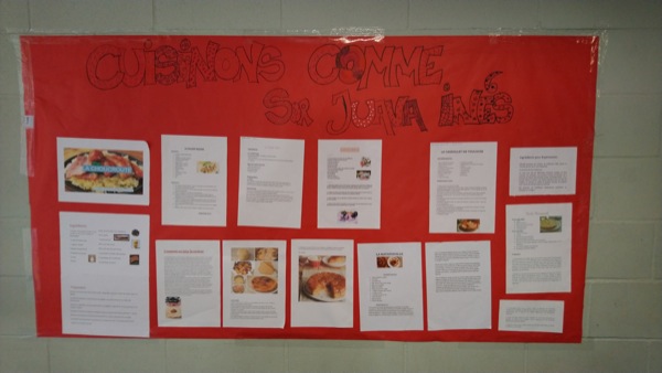 Finalment, al sostre dels passadissos de la segona planta s’han penjat diferents estris de cuina de cartolina de colors amb els seus noms en les quatre llengües que es treballen al primer cicle de l’ESO: català, castellà, anglès i francès.