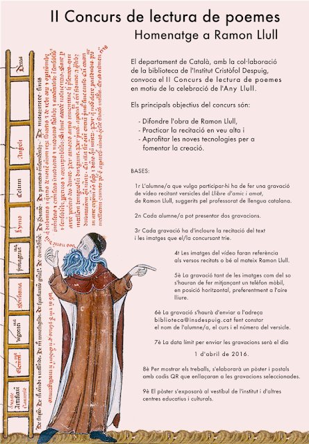 Per començar, el departament de Català li ha dedicat el segon Concurs de lectura de poemes, un concurs adreçat a l’alumnat de batxillerat que ha consistit a gravar en vídeo amb un mòbil una lectura en veu alta d’una versió moderna dels versicles del Llibre d’amic e amat.