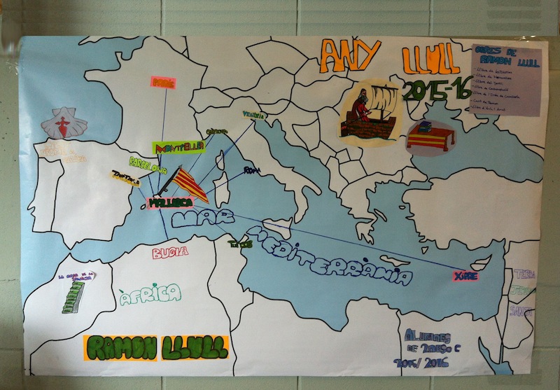 Una altra activitat és la que ha fet l’alumnat de 2n ESO C, a la classe de Ciències socials, que ha elaborat un mural amb un mapa dels llocs que Ramon Llull va visitar al llarg de la seua vida. El mural es pot veure al vestíbul de l’institut.
