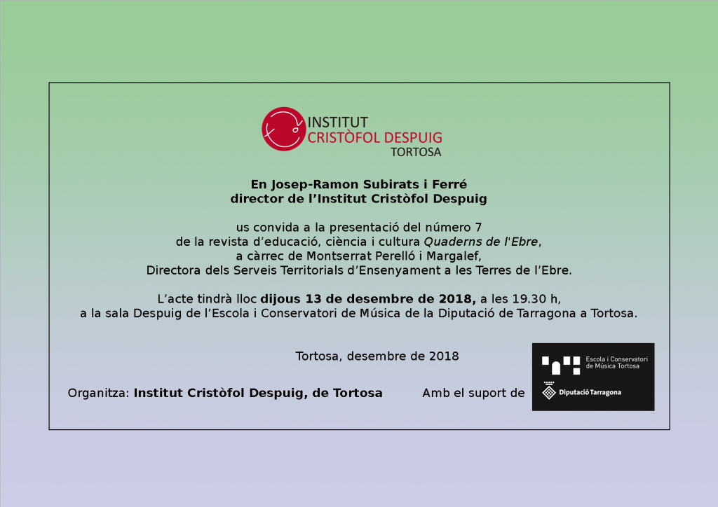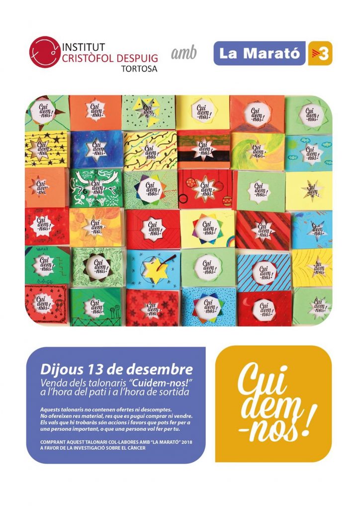 Durant aquests dies de desembre l’alumnat de 4t d’ESO està venent números per al sorteig d’una cistella de Nadal en combinació amb la loteria de Nadal. Donem gràcies als col·laboradors que de forma desinteressada han donat productes dels seus comerços per fer possible aquesta iniciativa. Col·laboradors: Marisma, Confeccions Castellà, Soldebre, Farmàcia Ferreres, Oficomplet, El […]