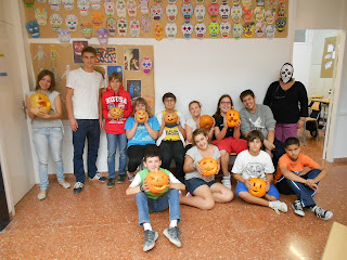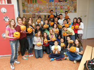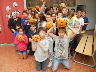 We thoroughly enjoyed Halloween at the school. As a class we watched various videos on how to carve pumpkins which gave us ideas for making our own. The class also coloured in and cut out masks which were put together to make a mural. This was then put on the wall for everybody to see. The pumpkins were very beautiful and we all had a lot of fun.