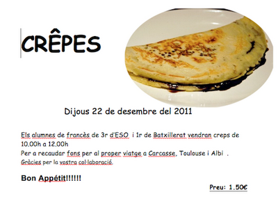 Creps per a esmorzar l’últim dia de classe abans de Nadal informador15/12/11 Dijous 22 de desembre, us proposem un esmorzar boníssim. A partir de les 11.30 h, els alumnes de Francès vendrem creps per recaptar fons per al viatge que farem a Carcassonne, Toulouse i Albi. Us llepareu els dits!