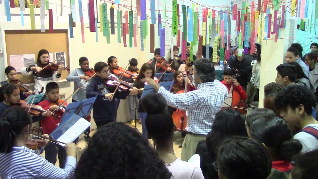 Com ja és tradicional, el professorat i personal d’administració va rebre l’alumnat cantant nadales al vestíbul del centre el darrer dia del trimestre abans de la festes d’hivern. Aquest any l’orquestra del barri, formada per alumnat de 6è de primària de l’escola Pau Vila i de 1r d’ESO del nostre institut van acomiadar a l’alumnat