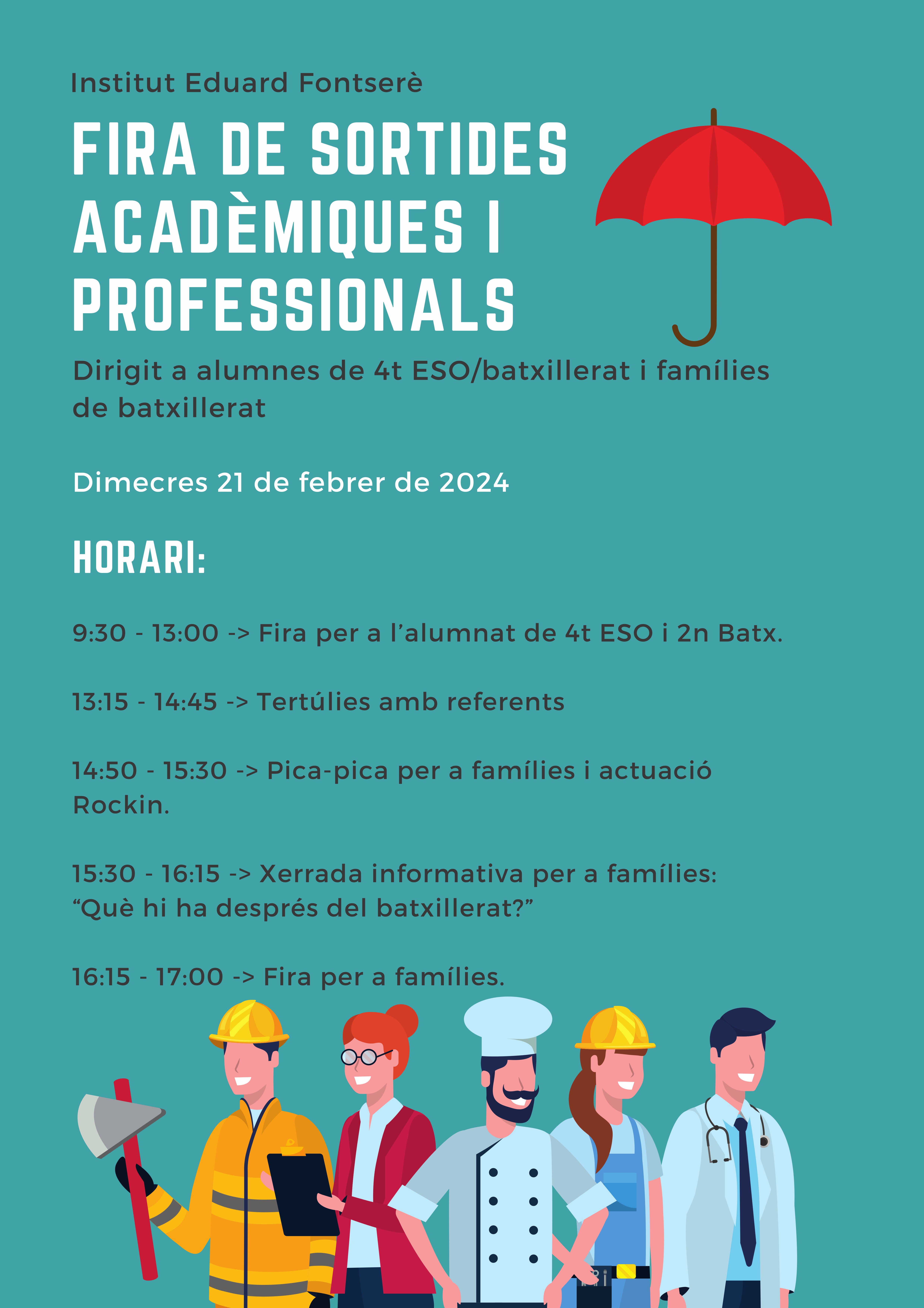 Els alumnes de 1r de Batxillerat han realitzat amb entusiasme i dedicació la 3a edició de la “Fira acadèmica i de sortides professionals”, dirigida a estudiants de 4t d’ESO, 2n de Batxillerat i les seves famílies. Amb una gran varietat d’expositors i conferències, l’alumnat ha proporcionat informacions i orientacions educatives i professionals actualitzades a la resta de l’alumnat interessat. A més, per afegir un toc d’entreteniment, les actuacions de Rock’in i un gran pica pica realitzat pels mateixos alumnes han complementat perfectament l’ambient de la fira, creant una atmosfera dinàmica i divertida per a tots els assistents. En resum, gràcies als esforços dels alumnes i a la diversitat d’activitats, la fira ha estat una experiència enriquidora per a tots els participants un any més. Gràcies.
