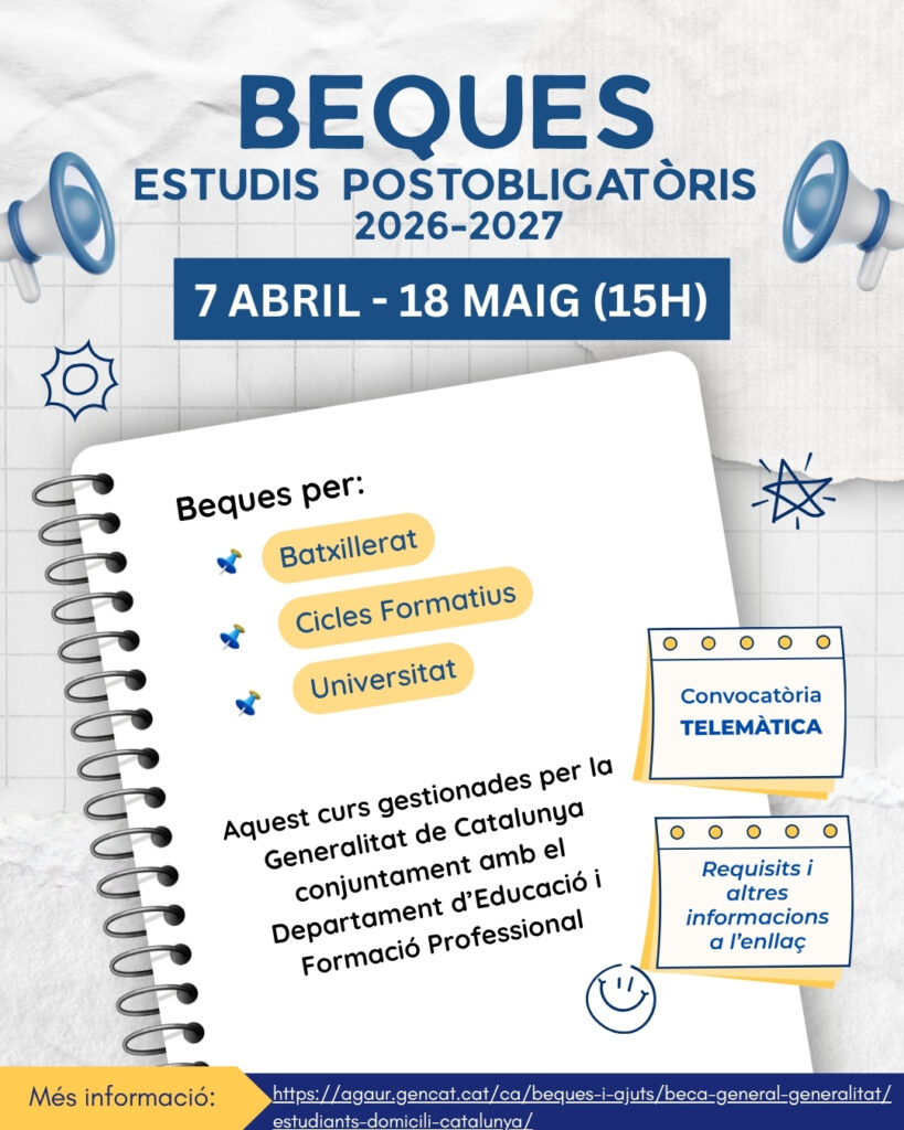 Han sortit publicades les bases de la convocatòria de beques per a estudis postobligatoris per al curs 2026-2027, que aquest curs les gestiona la Generalitat de Catalunya conjuntament amb el Departament d’Educació i Formació Professional. La convocatòria és telemàtica. El termini per sol·licitar la beca és: del 7 d’abril fins al 18 de maig a les […]