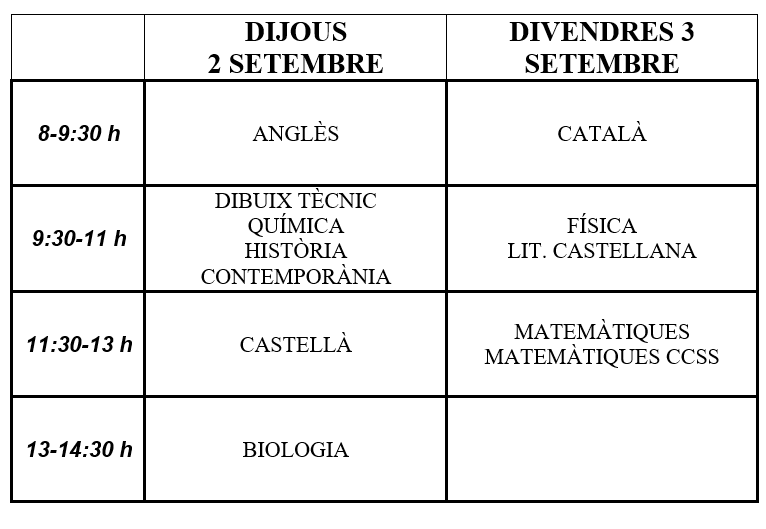 CALENDARI EXÀMENS EXTRAORDINÀRIA 1r BATXILLERAT SETEMBRE 2021