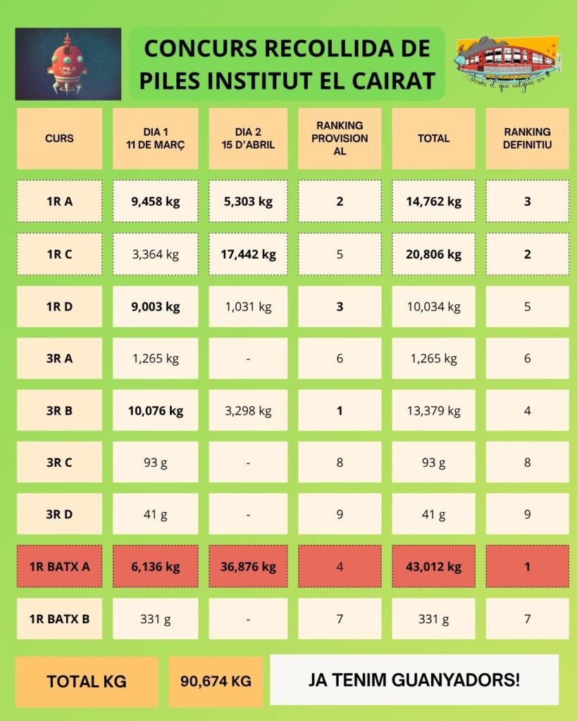 Aquest curs, des de l’Escola Verda de l’Institut El Cairat hem organitzat dos concursos per classes que han funcionat molt bé. D’una banda, el concurs APILO, d’àmbit català, en què hem recollit un total de 90,6 kg de piles. La classe guanyadora ha estat 1r de Batxillerat A, amb 36,9 kg.