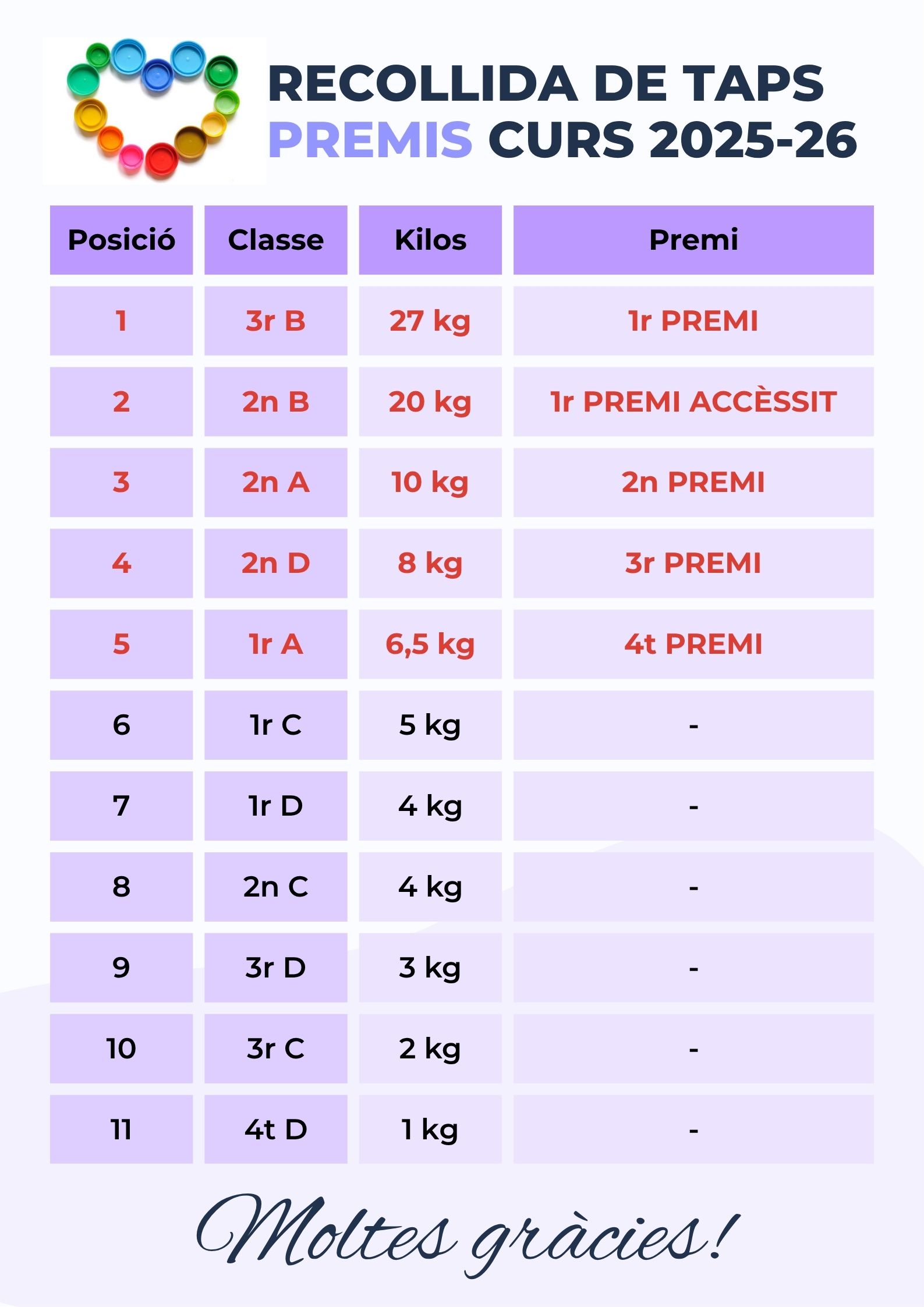 D’altra banda, també hem fet la recollida de taps solidaris per classe, que hem destinat a la Fundació SEUR, i hem arribat als 90,5 kg en total. La classe guanyadora ha estat 3B amb 27 kg, i s’ha donat un accèssit a 2n B amb 20 kg. Els premis són esmorzars per a les classes guanyadores.