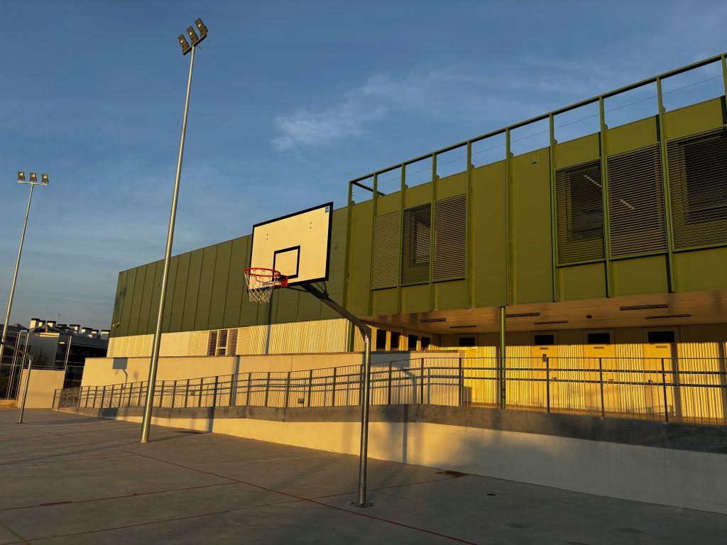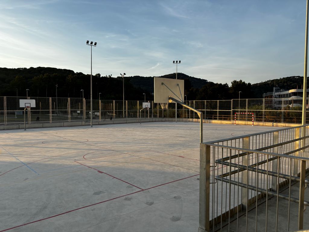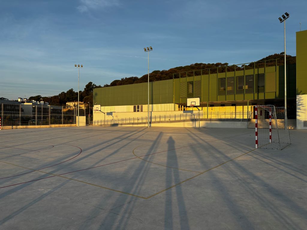 L’exterior de l’edifici es dibuixa a partir d’un gran espai d’esbarjo, amb taules de pícnic, bancs, arbres i taula de ping-pong, i una pista poliesportiva amb porteries de futbol sala i dos camps de bàsquet que es transformen en pista de vòlei. Per acabar, un gran espai polivalent que ens serveix tant de gimnàs cobert com de sala per a tota mena d’actes.