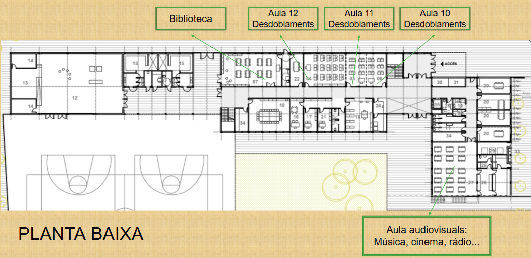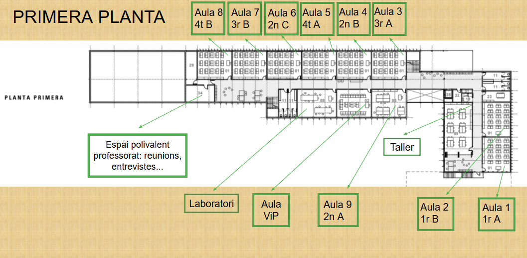 El centre s’organitza en dues plantes: la planta baixa, on trobem la consergeria, administració, direcció, sala de professors, les aules de desdoblament, la biblioteca i l’aula polivalent. A la primera planta, les aules de tutoria i les específiques: taller-FAIGLAB, laboratori i aula d’expressió artística.