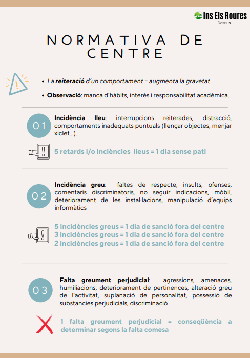 L’institut Els Roures s’organitza mitjançant les Normes d’Organització i Funcionament del Centre (NOFC) que consta d’un document central i un conjunt d’annexes. A continuació, es mostra una infografia de la Normativa del Centre i l’annex en relació al Protocol de Convivència. Aquest protocol va ser actualitzat al febrer de 2025, i estableix de manera més detallada el funcionament del centre amb concordància amb el Decret 102/2010 d’autonomia dels centres educatius. En particular, aquests dos documents son l’eina que prioritza les mesures educatives i restauratives del centre, i on es destaca la nostra voluntat de fomentar la reflexió i el compromís d’excel·lència de l’alumnat.