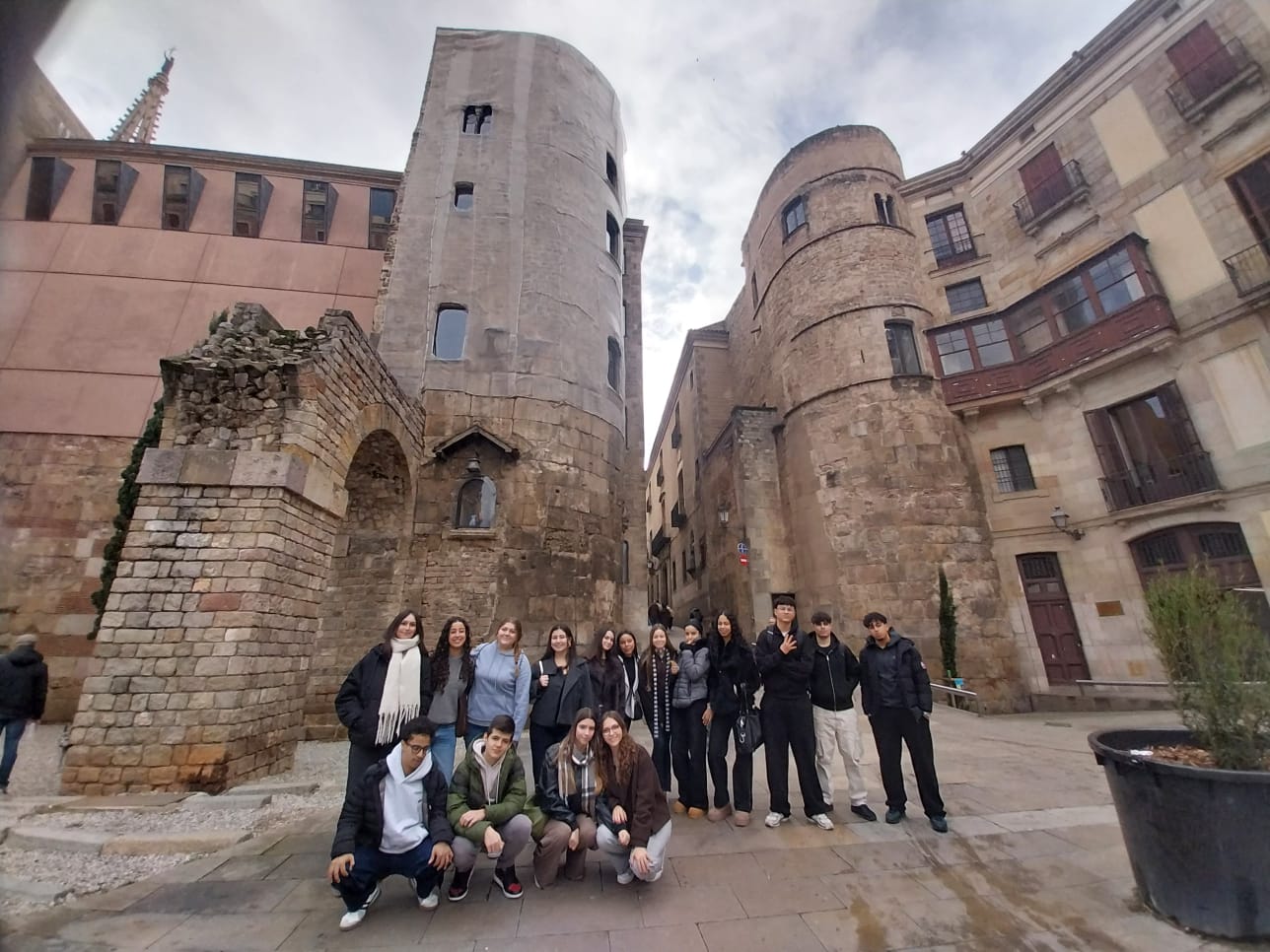 L’alumnat de Llatí de batxillerat va poder descobrir in situ els vestigis que encara resten en peu de la ciutat romana de Barcino per entendre les dimensions i el modus vivendi dels nostres avantpassats. Després de contemplar la necròpolis situada extramurs de la ciutat, es van dirigir cap a la porta decumana, on finalitza l’aqüeducte que conduïa aigua a l’antiga ciutat. Van passejar pel Fòrum, el cardo màximus, el decumanus màximus, la domus de Sant Honorat… i, per sort, es van poder refugiar de la pluja al temple d’August.