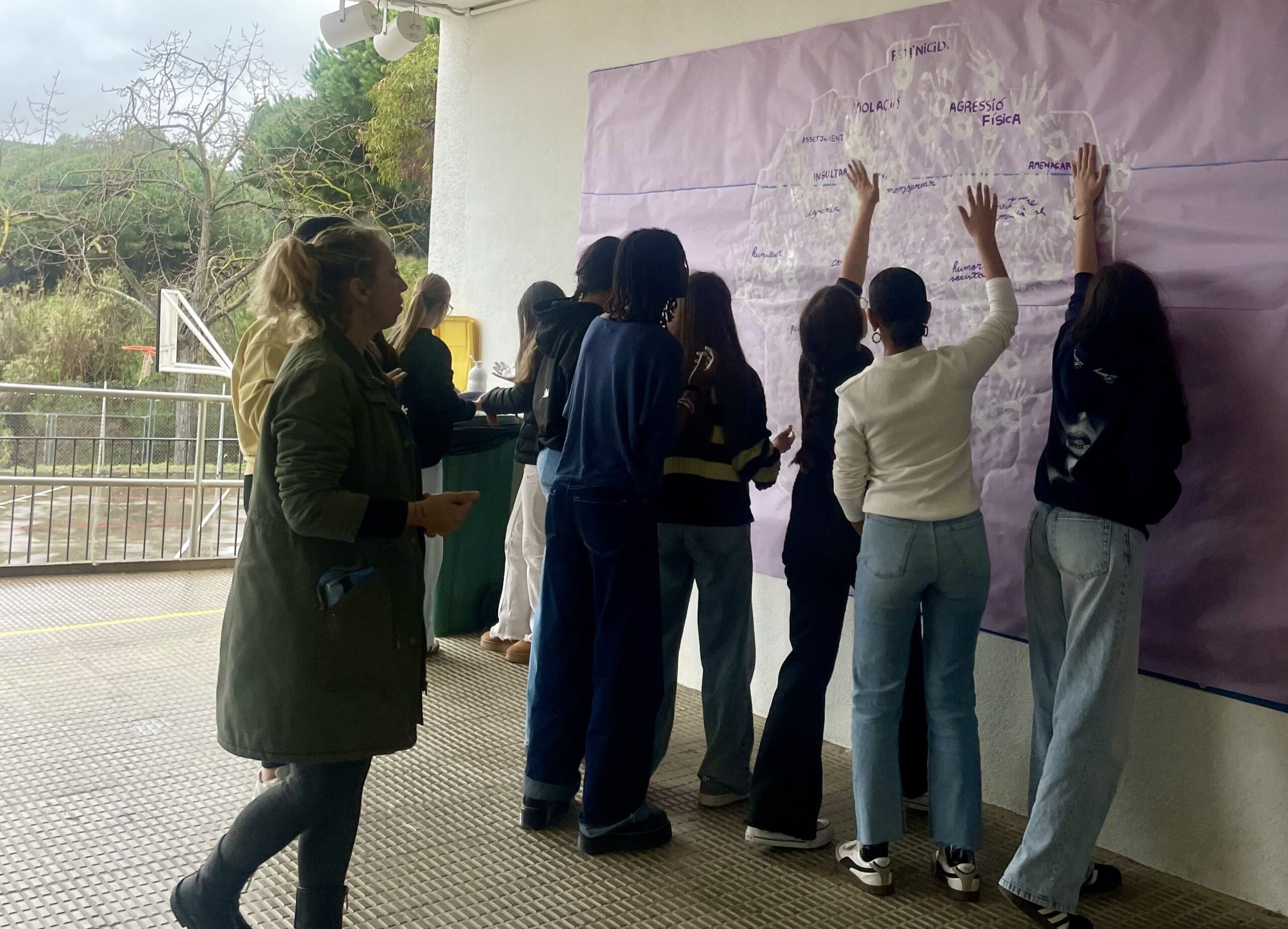 A les tutories de l’ESO, l’alumnat ha treballat la reflexió sobre les desigualtats i la violència que poden viure les dones a través de l’iceberg de la violència. Al pati del centre s’ha instal·lat un iceberg simbòlic on les alumnes han deixat la seva empremta amb les mans pintades. També s’han elaborat cartells de sensibilització fets per nois i noies. Una activitat per reflexionar i prendre consciència.