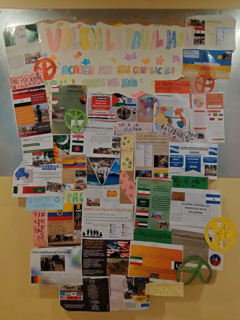 Actualment, hi ha molts conflictes armats al món. Els alumnes de 3r A i 3r B han investigat sobre aquestes guerres i han confegit un mural on, imitant un taulell d’anuncis ben atapeït, ens informen sobre elles i, sobretot, reclamen el seu final amb consignes pacifistes. D’aquesta manera, els nois i noies de 3r de