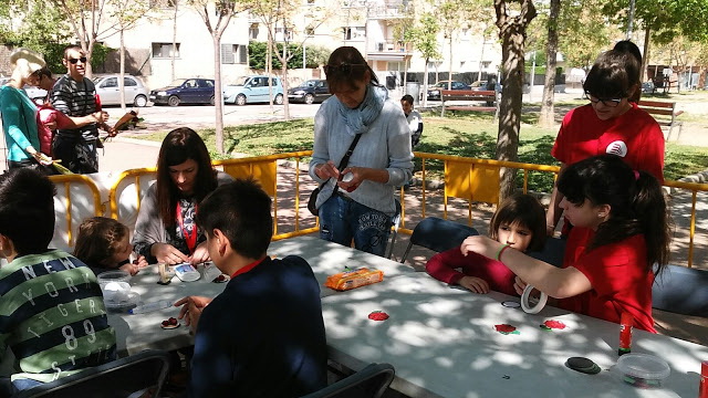 Pares i alumnes ens vam repartir les diferents activitats en torns i vam organitzar-nos per atendre el taller de manualitats, la parada de de llibres i la venda de roses i de loteria de Sant Jordi. El taller infantil oferia la possibilitat de decorar un punt de llibre al gust de cadascú afegint-hi dibuixos, frases… o bé de crear un imant molt original. Va ser tot un èxit!