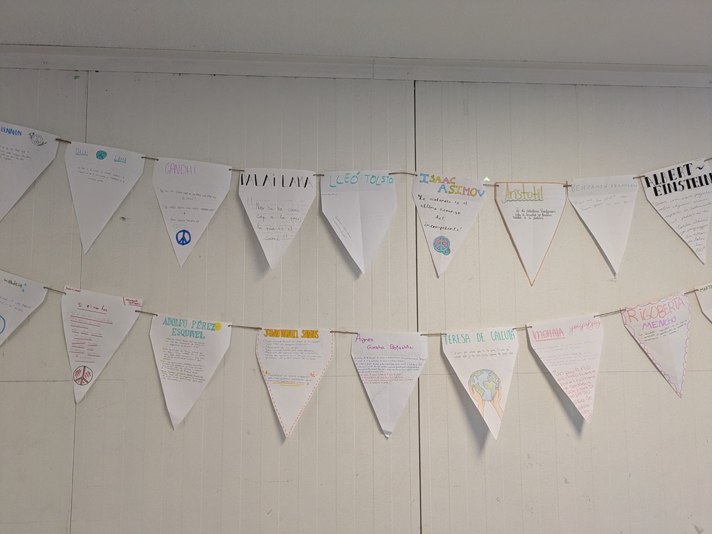 L’alumnat de 2n d’ESO ha elaborat, en parelles, una banderola dedicada a un personatge històric vinculat amb la pau. La tasca ha consistit a fer una cerca d’informació sobre el seu paper pacifista i a seleccionar-ne una cita significativa.