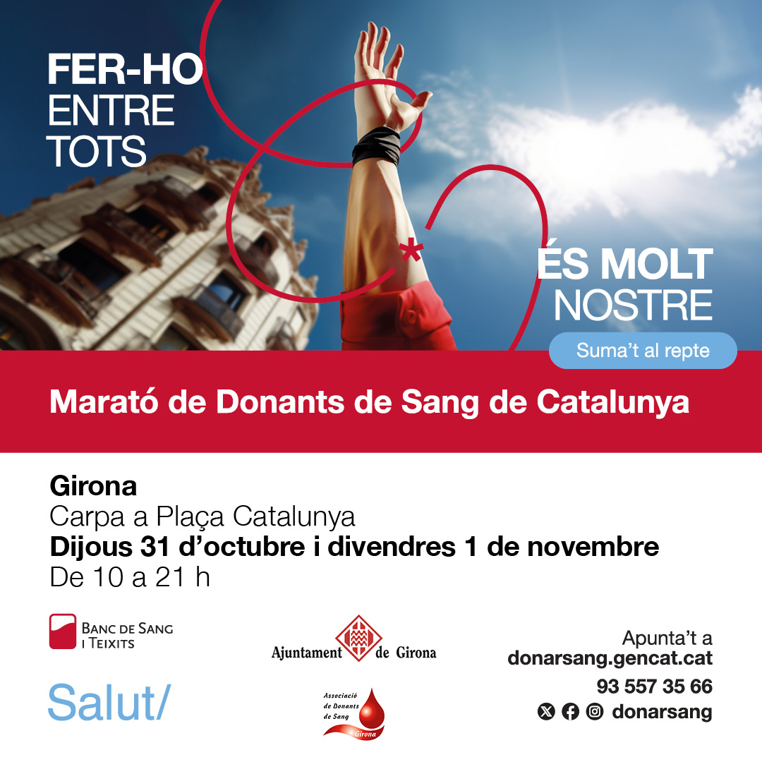 Marató de Donants de Sang Feu un comentari / Per admin / 24/10/2024 / 4t ESO Altres activitats Portada El proper 31 d’octubre i 1 de novembre un grup d’alumnes de 4t col·laborarem en la Marató de donació de sang que tindrà lloc a la Plaça Catalunya de Girona. Famílies, personal docent i PAS del nostre centre, us animem a sumar-vos-hi com a donants!