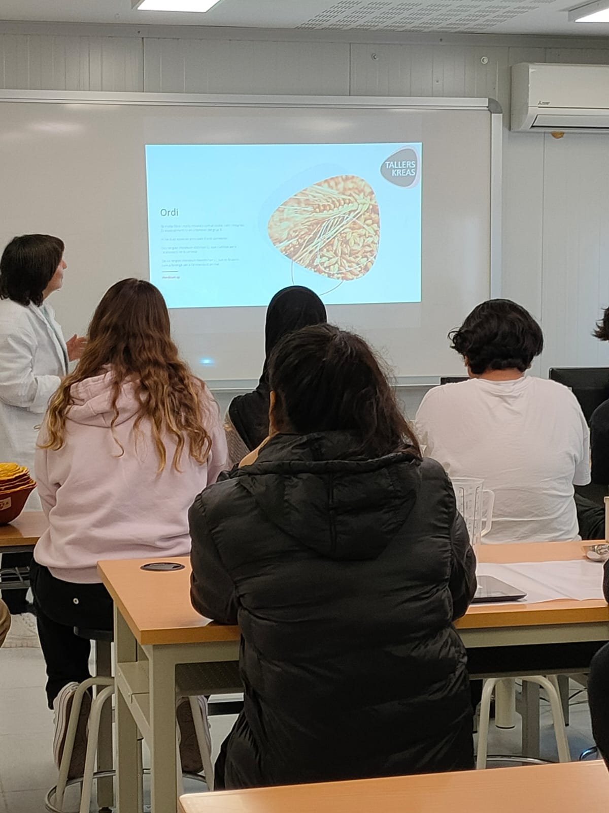 El taller s’ha dividit en dues parts, una teòrica i una pràctica. A la primera part, la professora ha explicat els diferents tipus de cereals, les seves propietats i la seva estructura. Seguidament, els alumnes s’han dividit en grups i han fet una identificació de cereals i una experimentació amb diferents farines per tal de poder deduir la seva composició i poder esbrinar quines tenien més o menys gluten.
