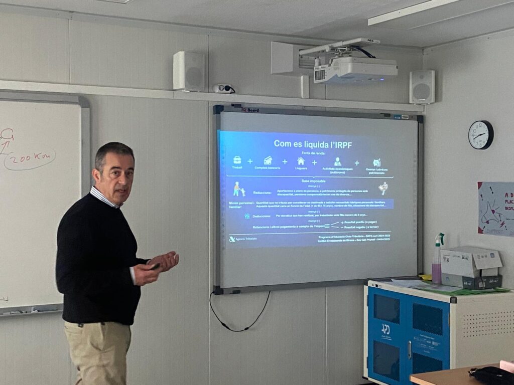 L’alumnat de les matèries de Funcionament de l’Empresa i Economia de 1r de batxillerat ha participat en una xerrada impartida per Santi Fariña, representant de l’Agència Tributària. Aquesta activitat s’emmarca dins del Programa d’Educació Cívic-Tributària, una iniciativa que pretén apropar als joves el funcionament del sistema fiscal i la importància de la responsabilitat ciutadana en l’àmbit tributari. Durant la sessió, l’alumnat va poder conèixer de primera mà com es gestionen els recursos públics, com funciona el sistema impositiu i quins són els drets i deures de la ciutadania en matèria fiscal. Una activitat molt enriquidora que ajuda a entendre millor el paper de l’economia en la vida quotidiana i en la construcció d’una societat més justa.