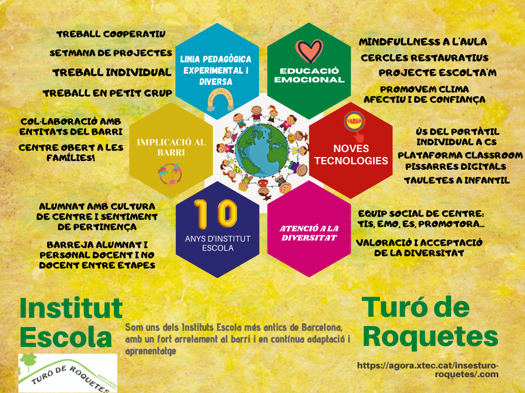 Dilluns 1 de març i dimarts 2 farem una trobada de màxim 10 persones al pati de l’escola, on us explicarem els trets més significatius del centre i resoldrem els dubtes que tingueu.