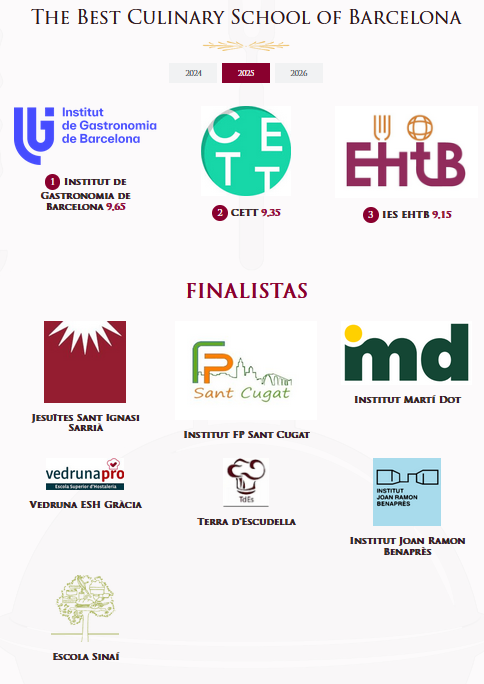 Aquest any 2025, als dos mesos d’obrir hem tingut l’honor de ser reconeguts com a Millor escola de Gastronomia de Barcelona per la Barcelona Gastronomic Society (BGS). Aquesta associació la formen un grup de persones amb amplis coneixements en gastronomia per dinar, sopar i valorar diferents aspectes de forma independent. No ens donem a conèixer i paguem sempre la factura. Immediatament després del dinar, ens reunim per valorar diferents aspectes com poden ser:
