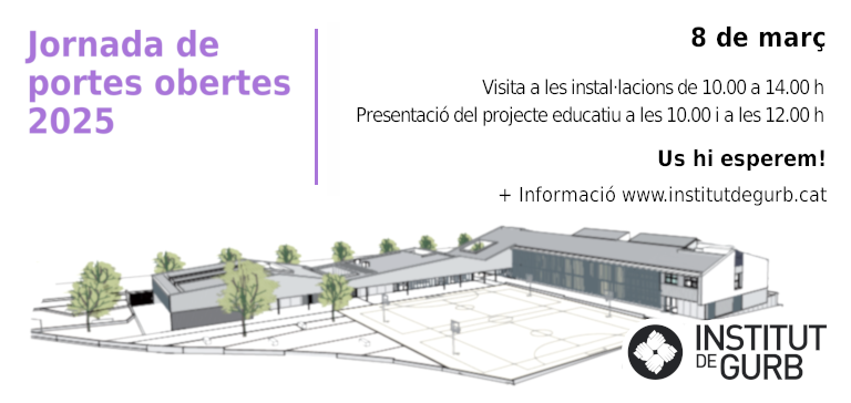 Aquest curs 2024-25, la Jornada de Portes Obertes de l’Institut de Gurb tindrà lloc el dissabte dia 8 de març de 10:00 a 14:00 h.