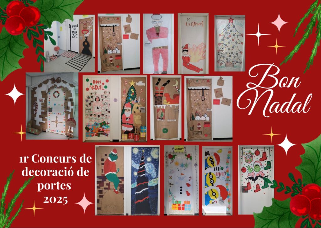 Enguany hem encetat la I Edició del Concurs de Decoració de Portes de Nadal i s’ha deixat el llistó ben alt. Fa tres setmanes, l’Equip Directiu va dotar cada grup classe d’una capsa amb un material limitat per tal que l’alumnat fes una creació innovadora inspirada en aquestes dates tan màgiques. El resultat és que l’austera matèria primera, que només podia enriquir-se amb elements de rebuig trobat per casa, ha donat pas a uns llenços d’allò més impressionants. La Mar, l’Eva, la Meri i la Sílvia volen enviar un agraïment a tots els alumnes, ja que s’han engrescat molt amb aquesta iniciativa. A més a més, volen felicitar especialment als grups de les portes guanyadores de cada nivell: 1rC, 2nA, 3rB i 4tA.