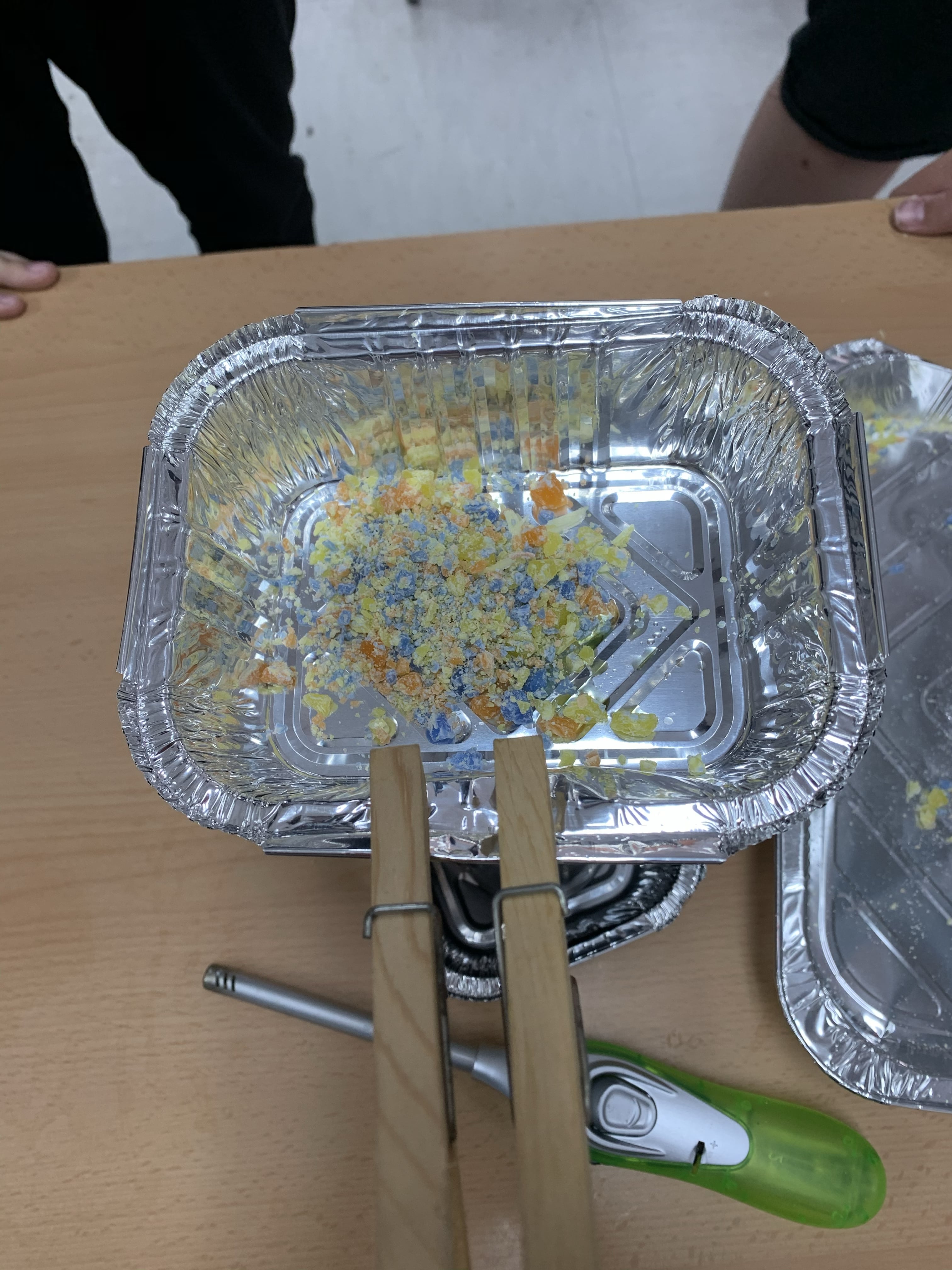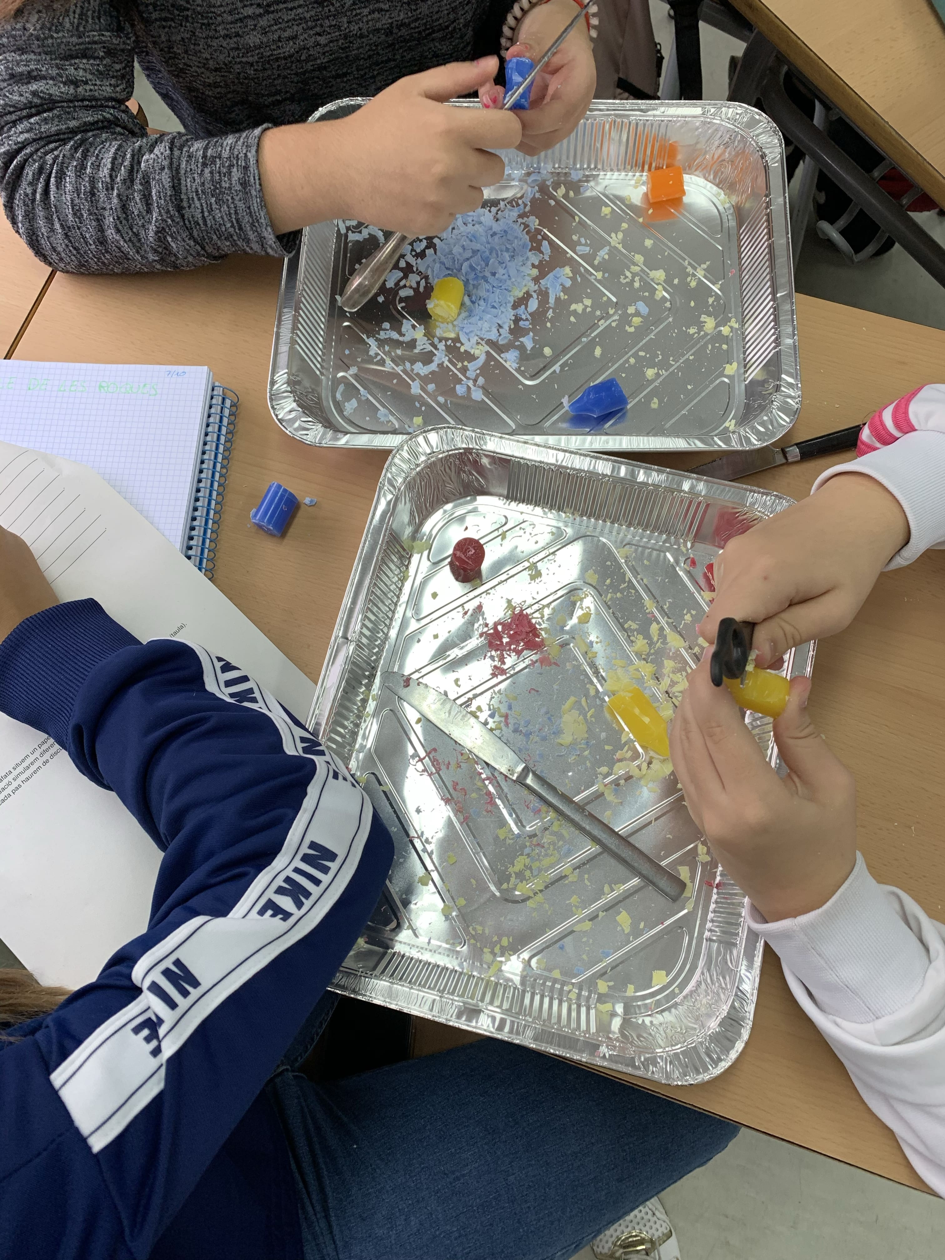 En les següents fotografies podeu veure els alumnes de 2n d’ESO on, a partir d’una pràctica, representen “El cicle de les roques”. Mitjançant ceres de diferents colors, simulen com es formen les roques sedimentàries, a partir de roques magmàtiques (raspant les ceres). Entenent el metamorfisme que pateixen les roques i com es tanca el circuit, desfent-se les roques en el magma. Al refredar-se la lava, es solidifica i es converteix en roques magmàtiques.