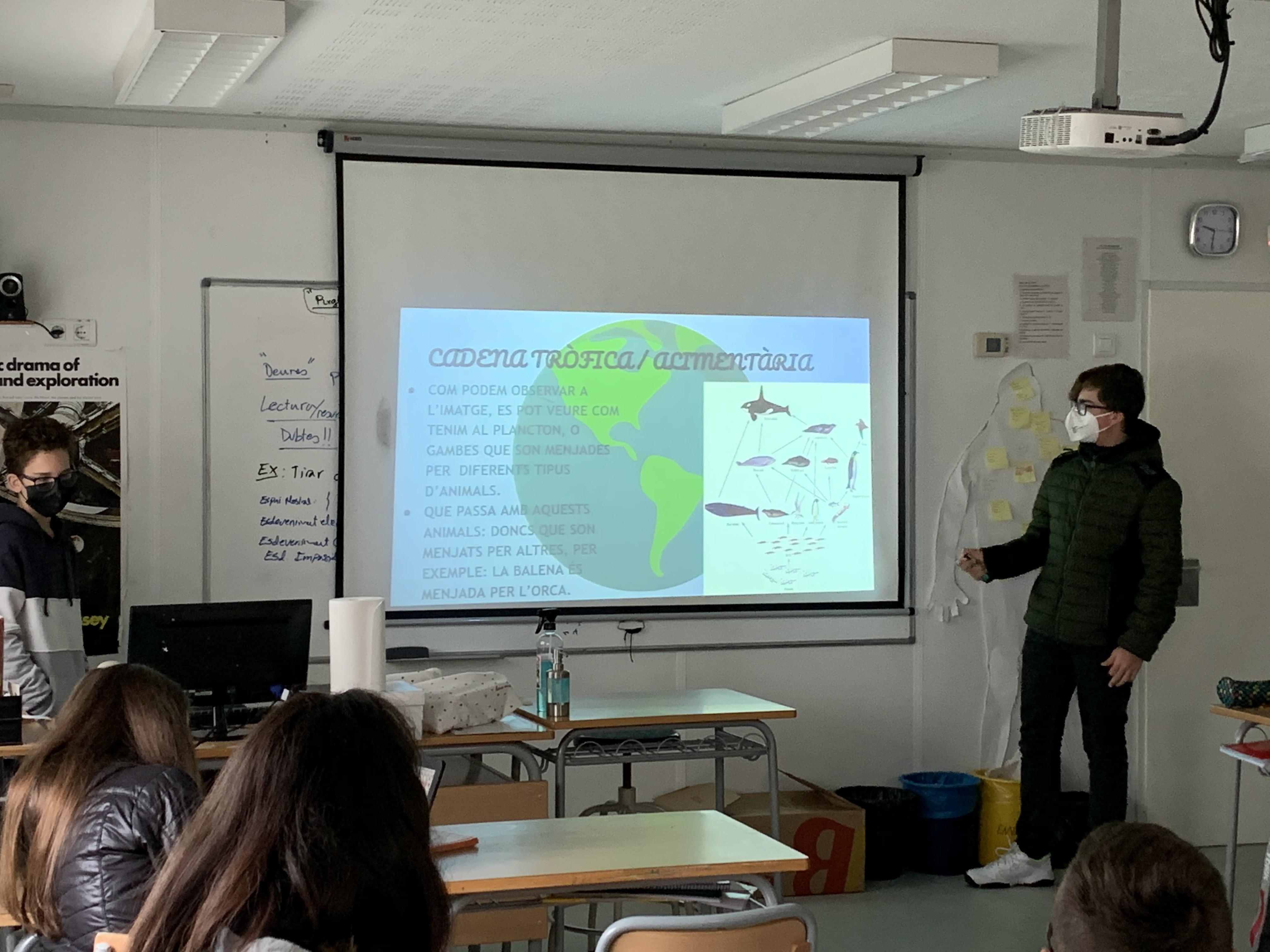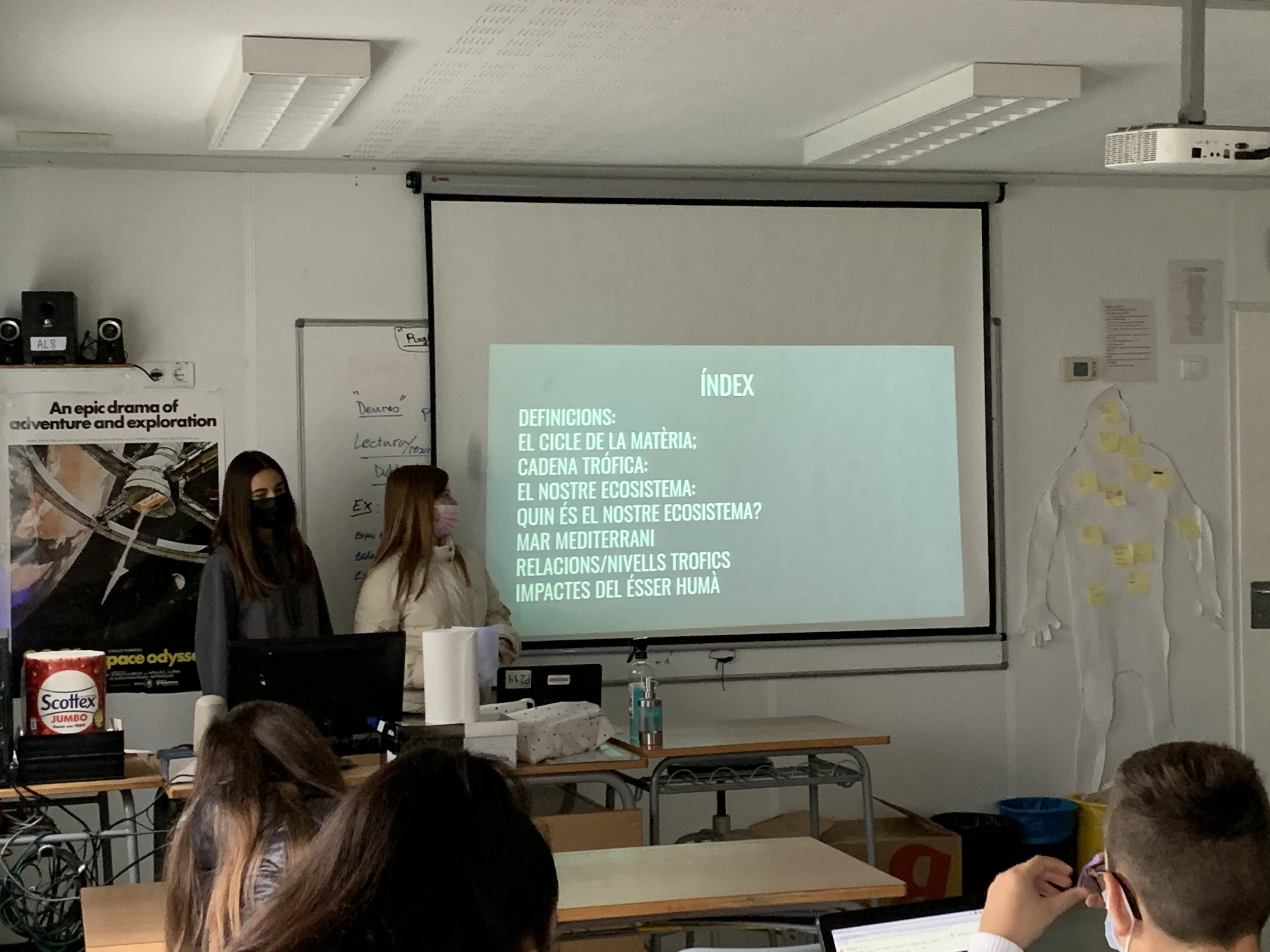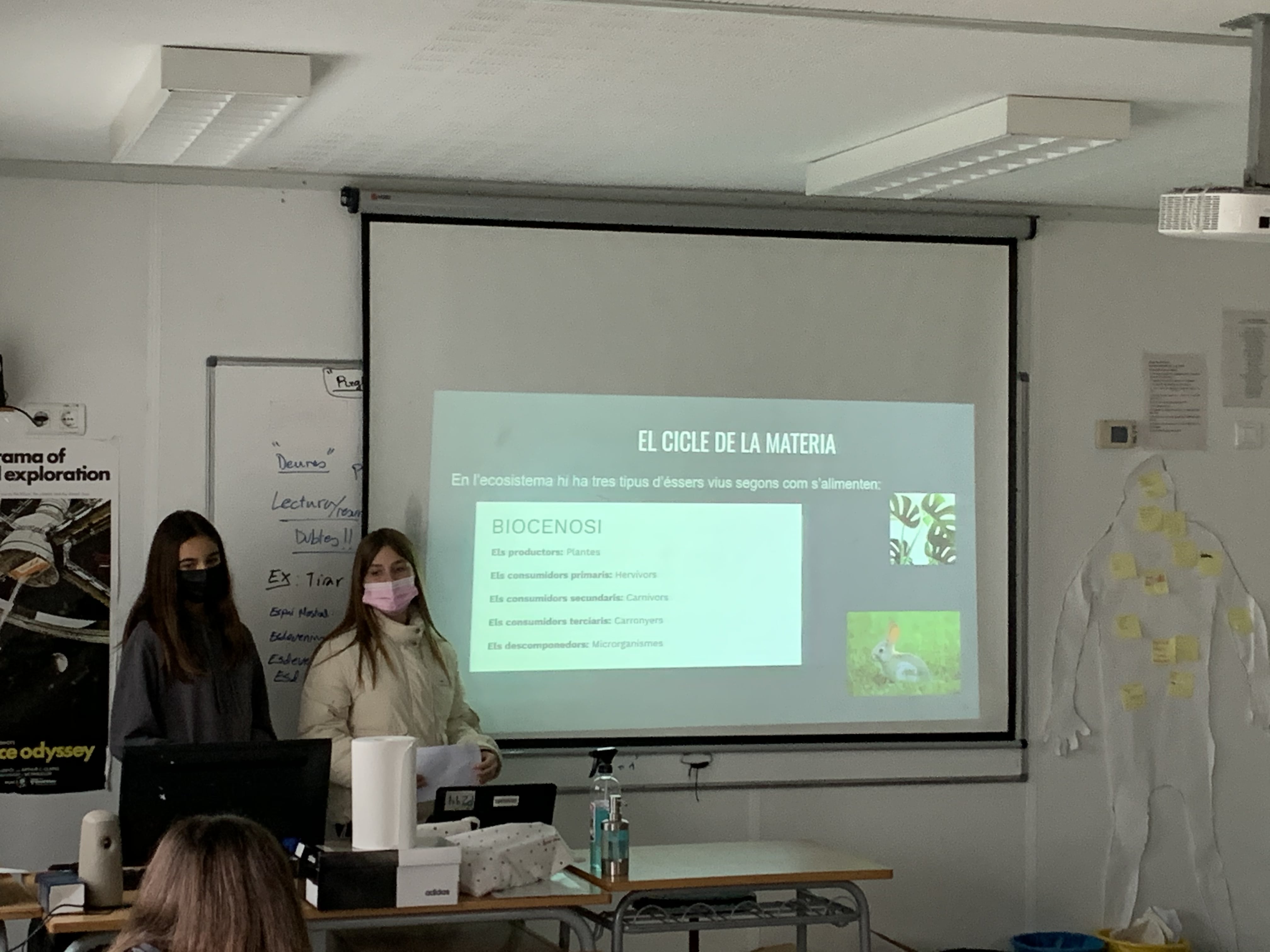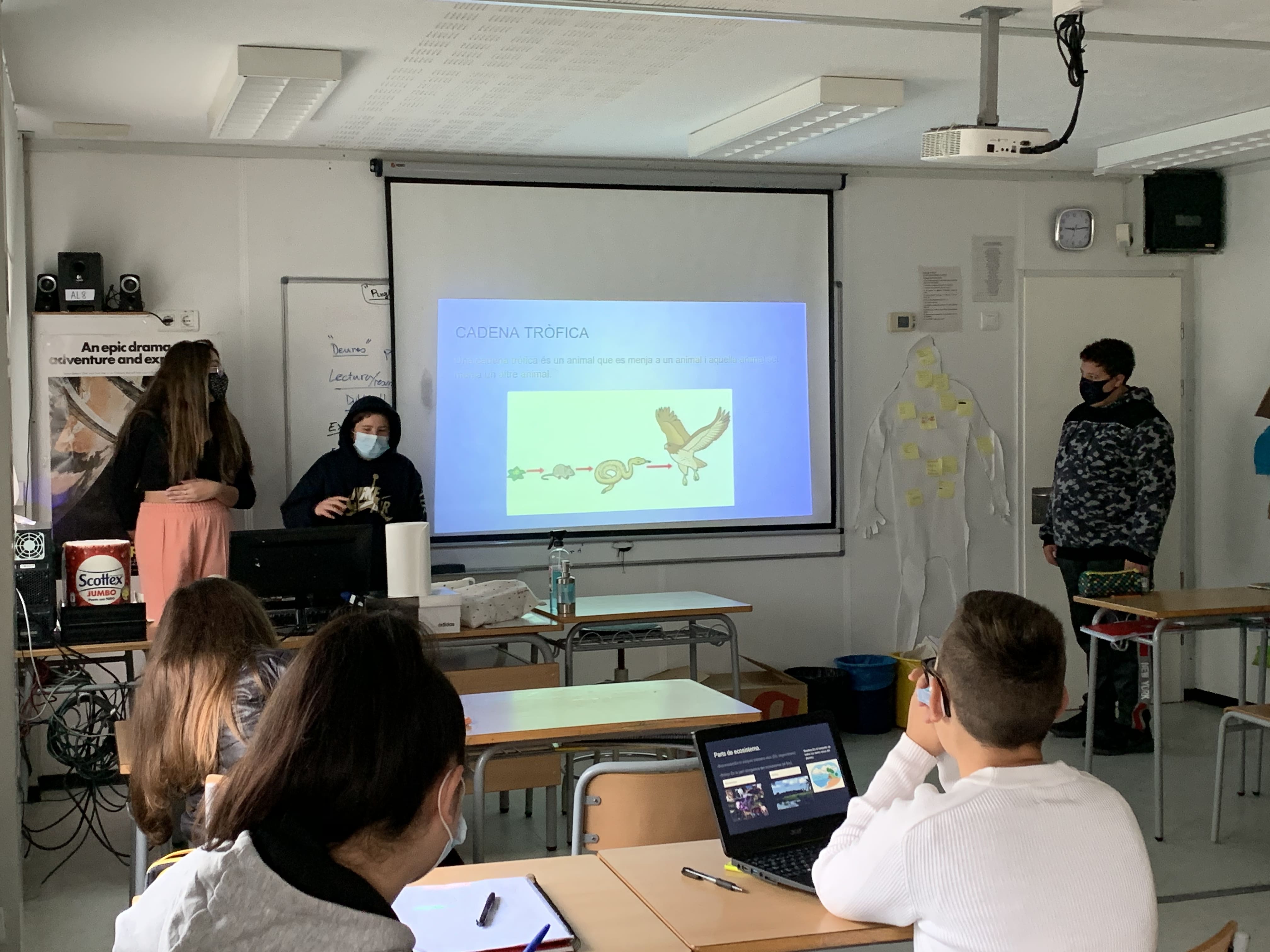 Durant la presentació, ens han explicat quins són els elements que formen un ecosistema i els han relacionat amb l’ecosistema d’estudi, així com també han representat una cadena tròfica. A més, han analitzat algunes causes i conseqüències de la destrucció dels ecosistemes, exposant algunes solucions davant d’aquests impactes o amenaces.