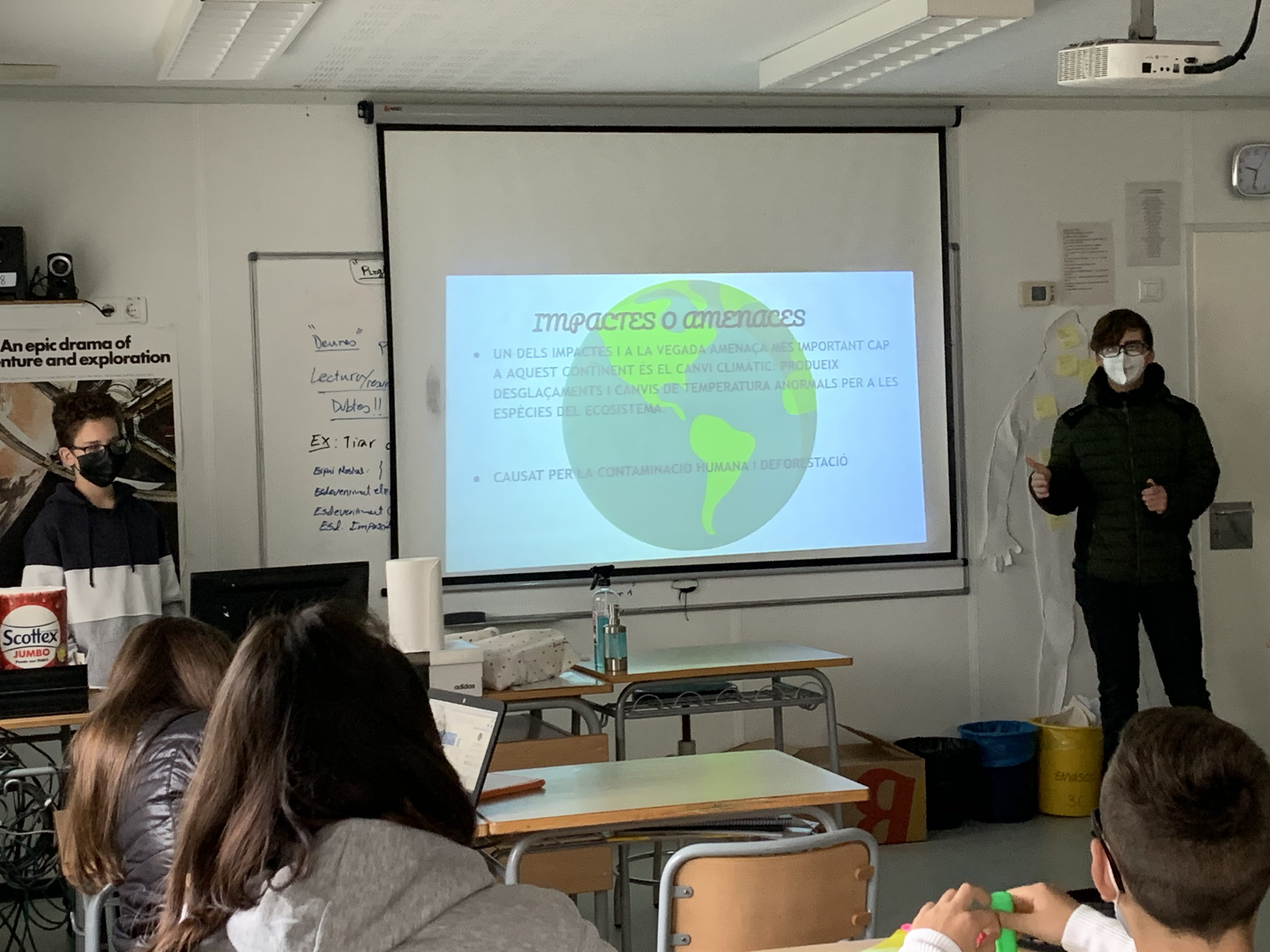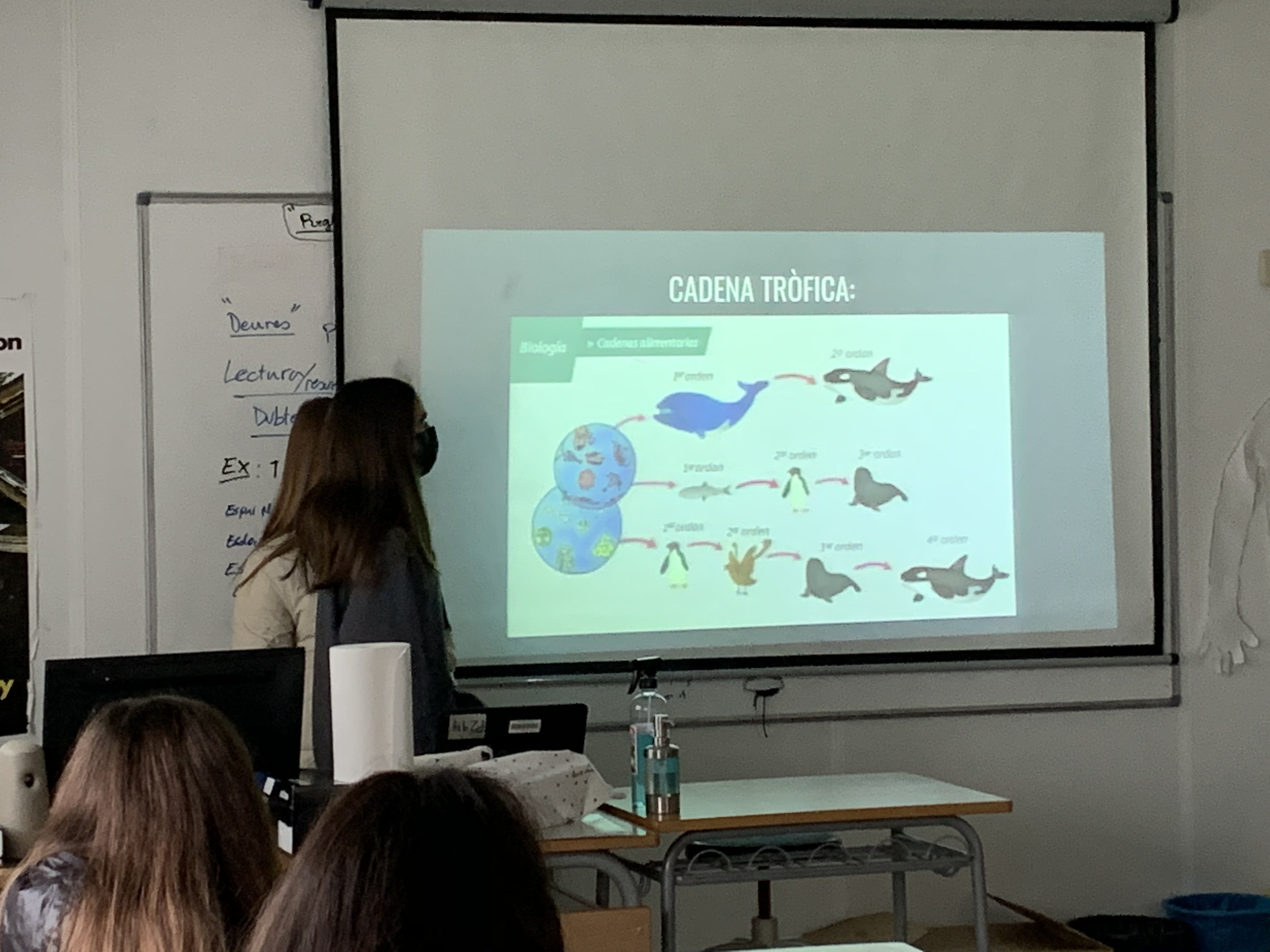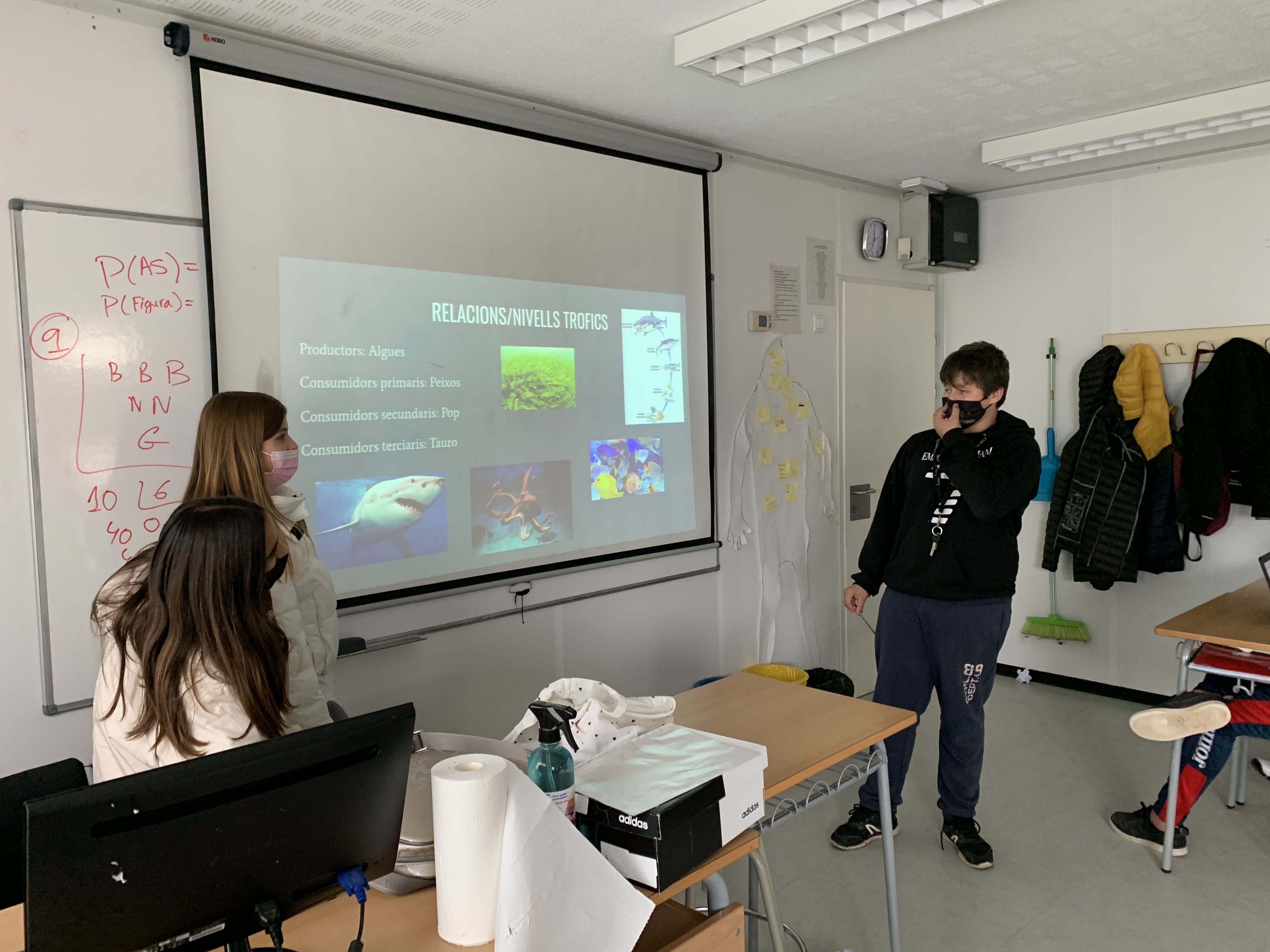 Durant la presentació, ens han explicat quins són els elements que formen un ecosistema i els han relacionat amb l’ecosistema d’estudi, així com també han representat una cadena tròfica. A més, han analitzat algunes causes i conseqüències de la destrucció dels ecosistemes, exposant algunes solucions davant d’aquests impactes o amenaces.