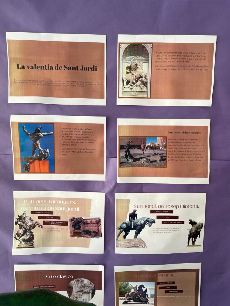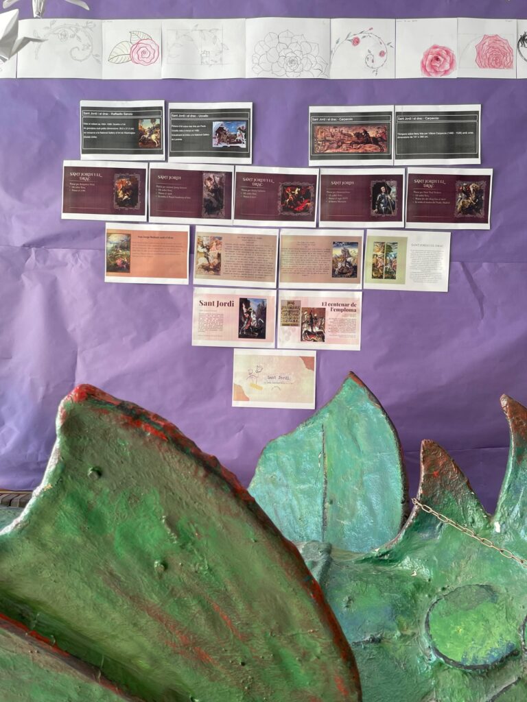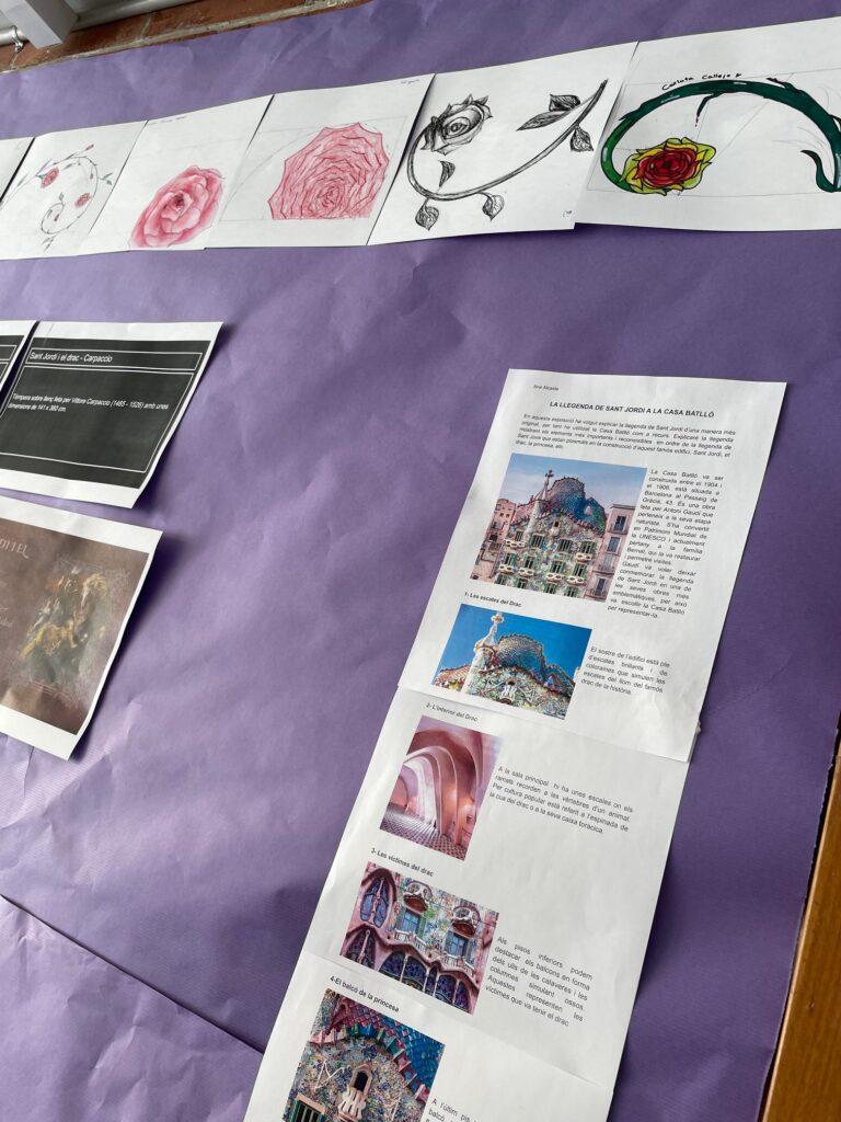Els alumnes de 1r de batxillerat d’arts plàstiques i disseny han treballat a l’assignatura de Projecte de Comissariat d’exposicions la representació de la llegenda de Sant Jordi al llarg de la història de l’art tant a la pintura com ara l’escultura o l’arquitectura. També han representat a l’assignatura de Dibuix Tècnic aplicat a les arts una rosa a partir de l’espiral àuria. Ells mateixos han muntat l’exposició dels seus treballs al vestíbul del centre.