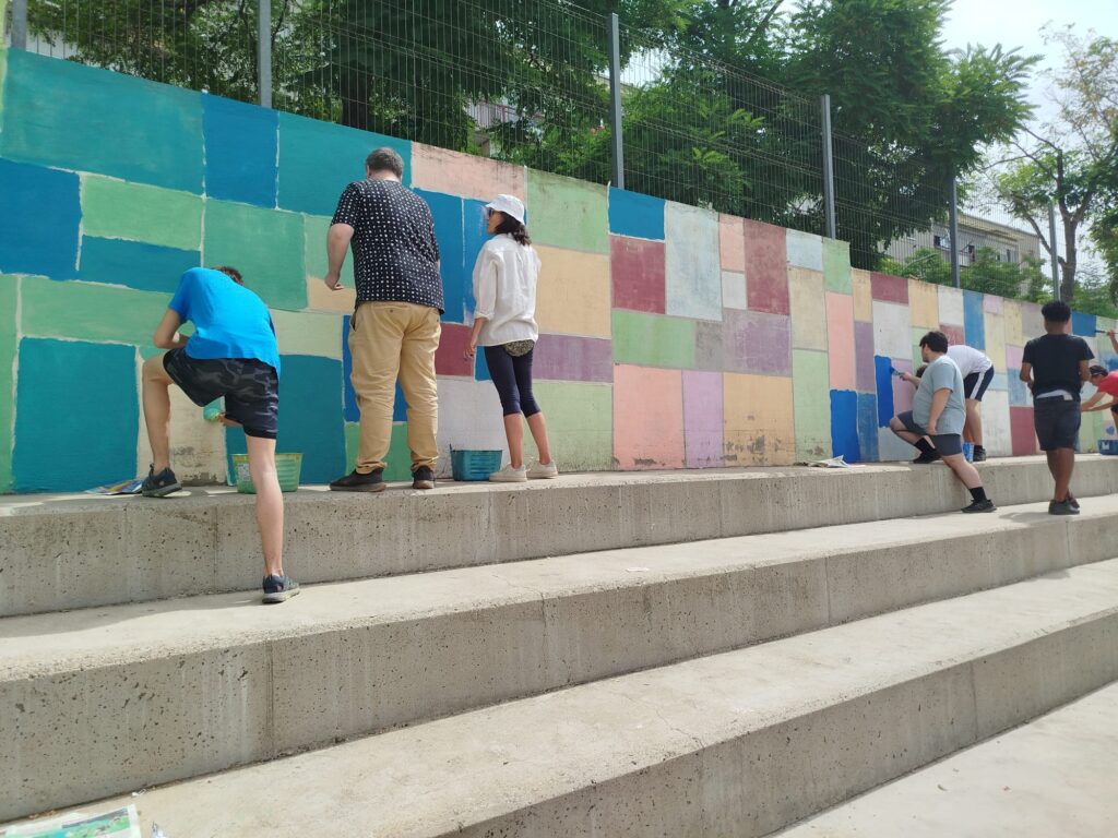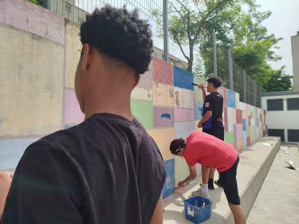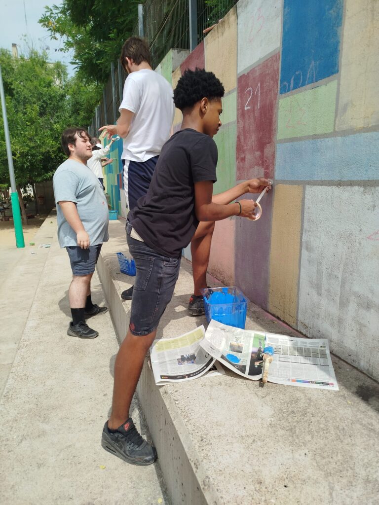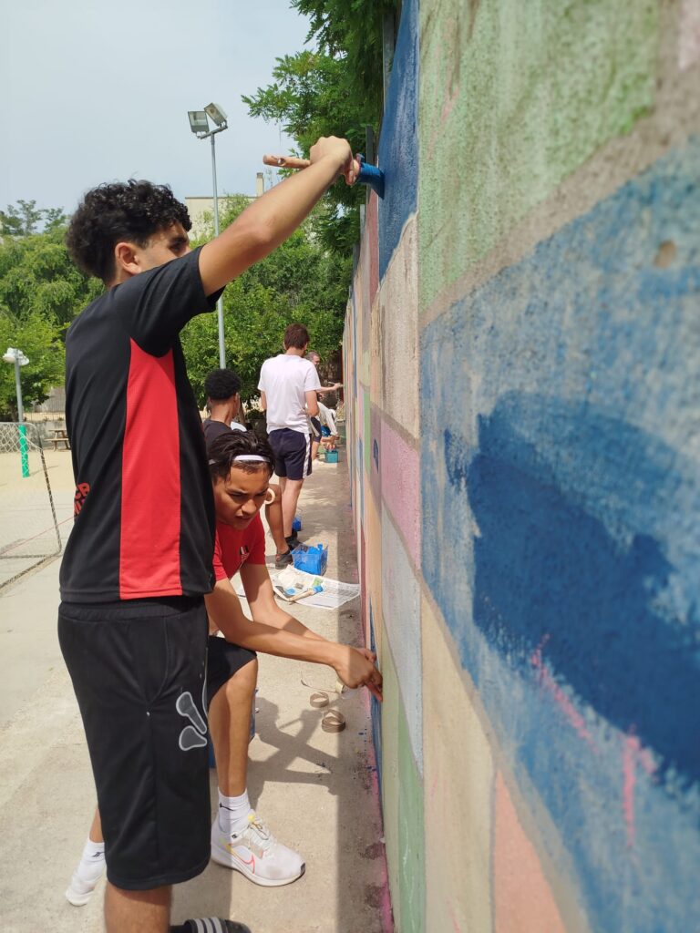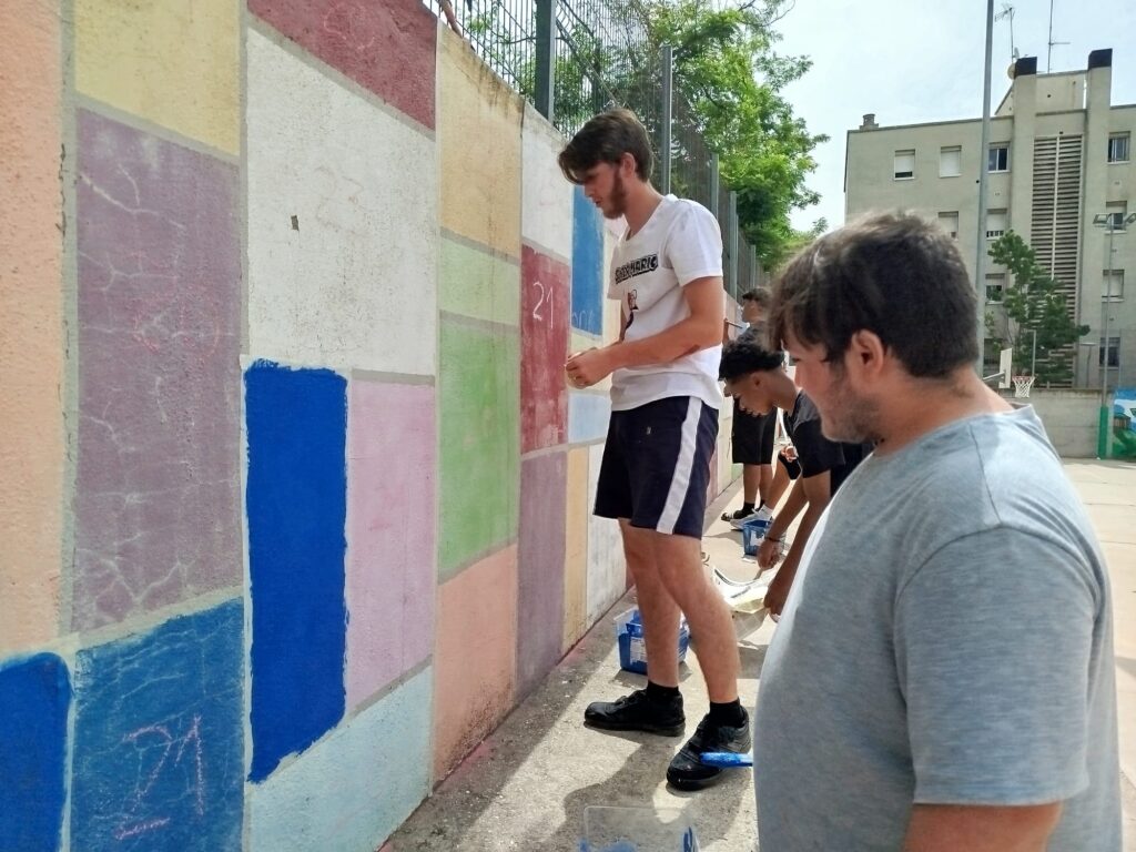 El dimecres 11 de juny es va donar una capa d’imprimació a tota la paret, i el divendres 13 es van pintar els diferents requadres seguint el disseny creat pels alumnes de 1r de batxillerat artístic. Finalment, el dilluns 16 vam repassar totes les línies i hi vam escriure el lema de l’escola: