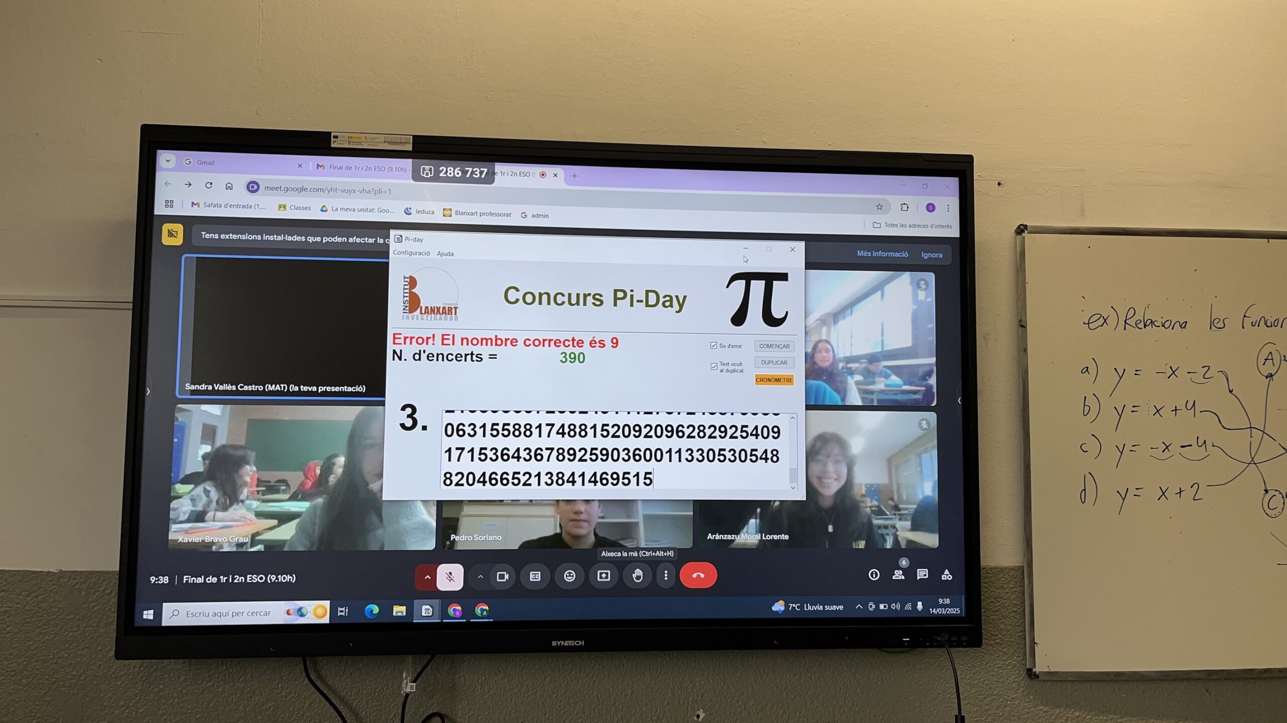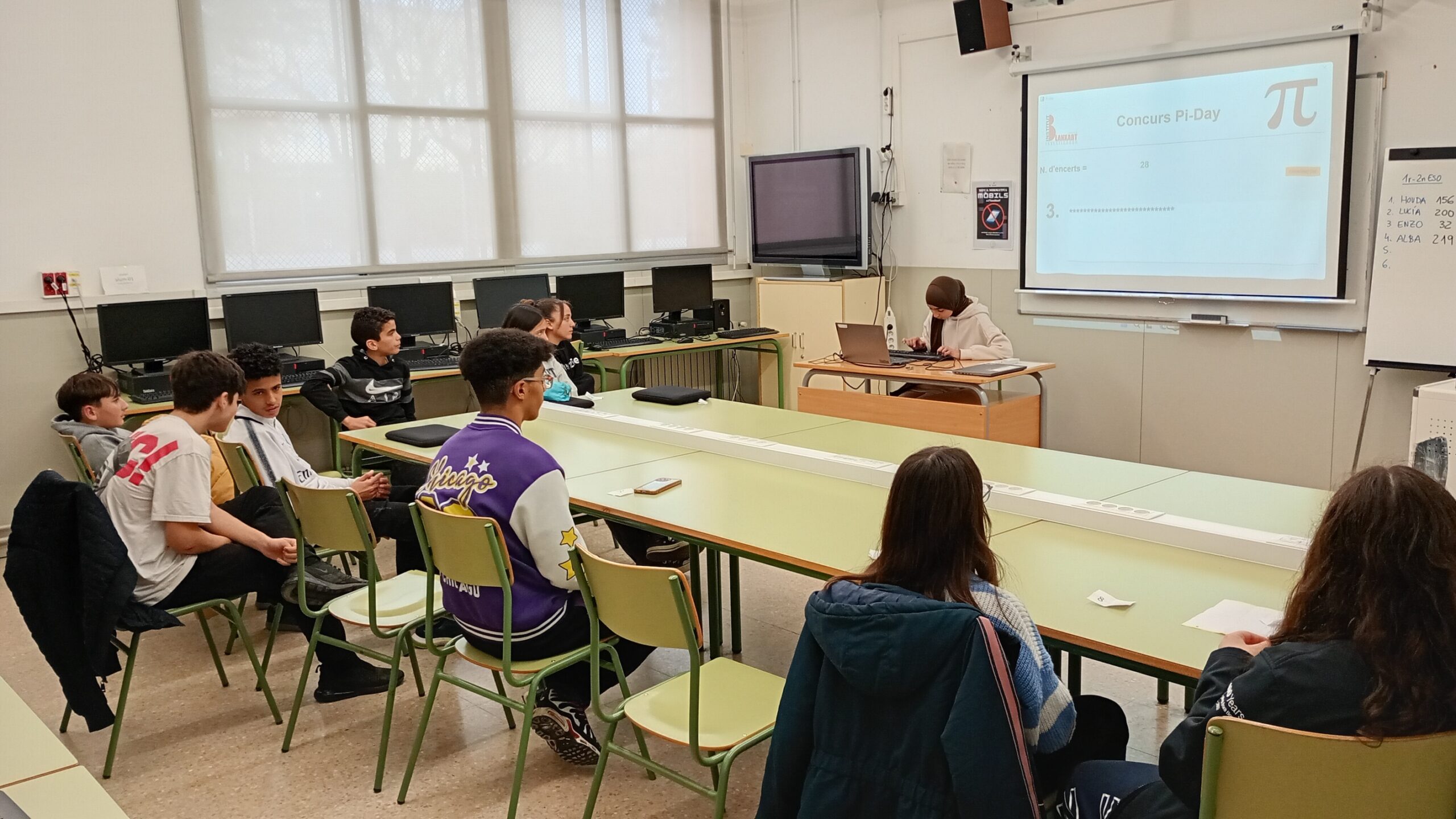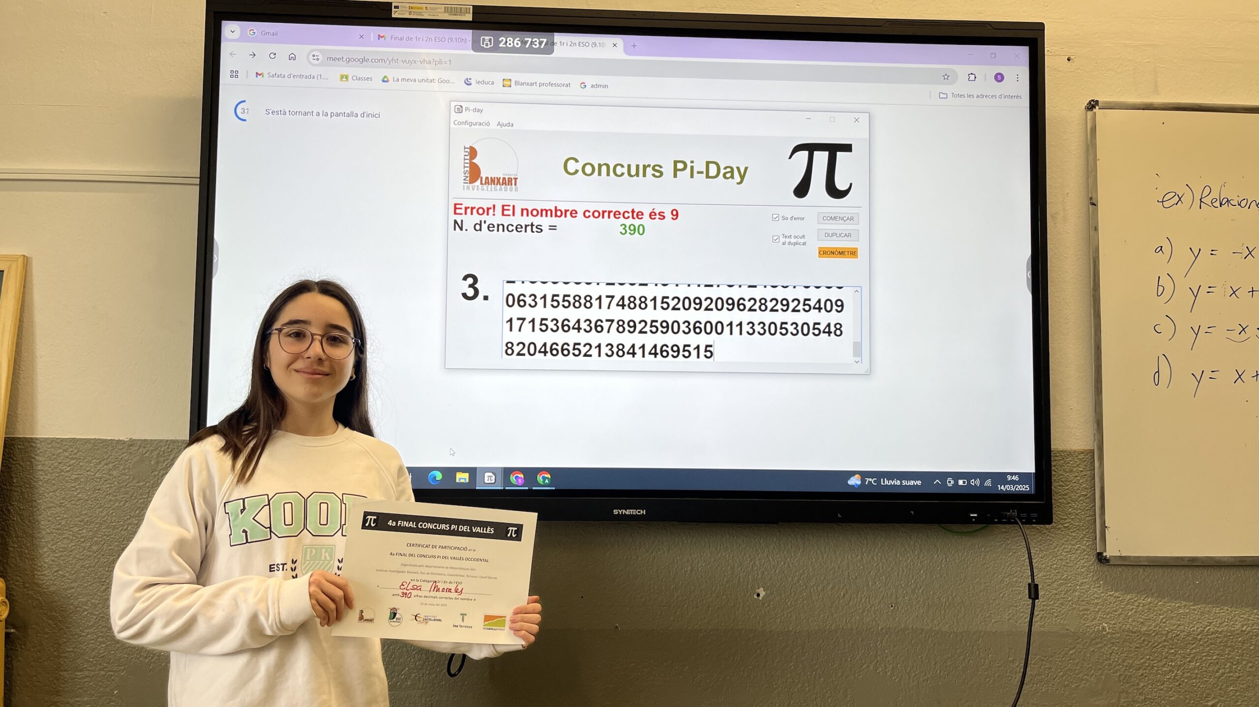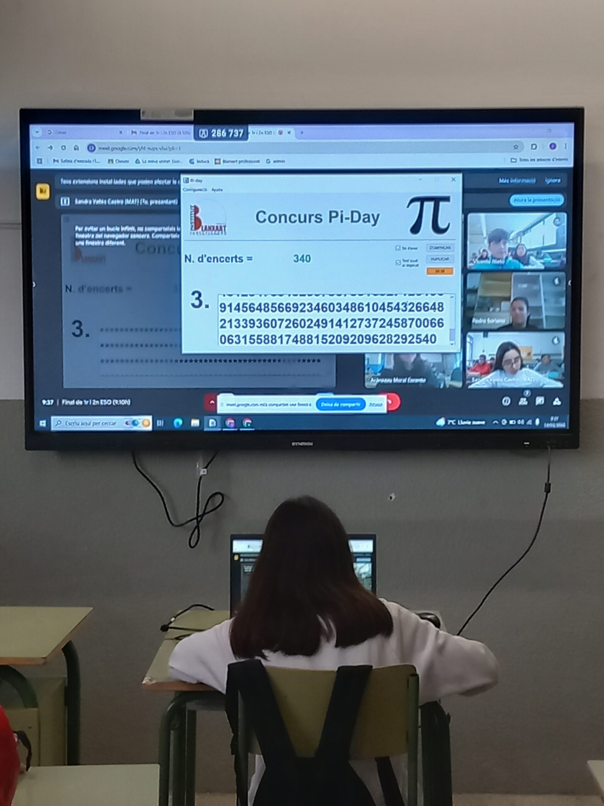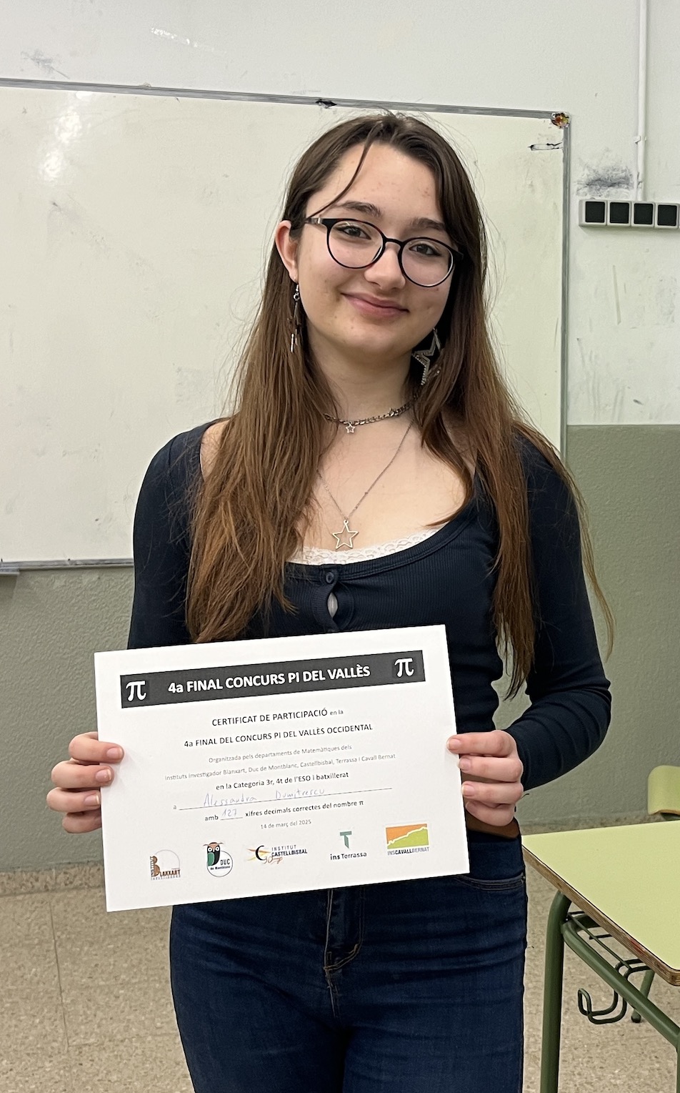 Dos dies després, el divendres 14 de març, els guanyadors del nostre centre van competir a la 4a edició del Concurs del Vallès, enfrontant-se als millors participants dels instituts Cavall Bernat, Castellbisbal, Terrassa i Duc de Montblanc. En la categoria de 1r i 2n d’ESO, l’Elsa Morales es va alçar amb la victòria, demostrant un domini espectacular dels decimals de π amb 390 xifres memoritzades! 🏆🔢
