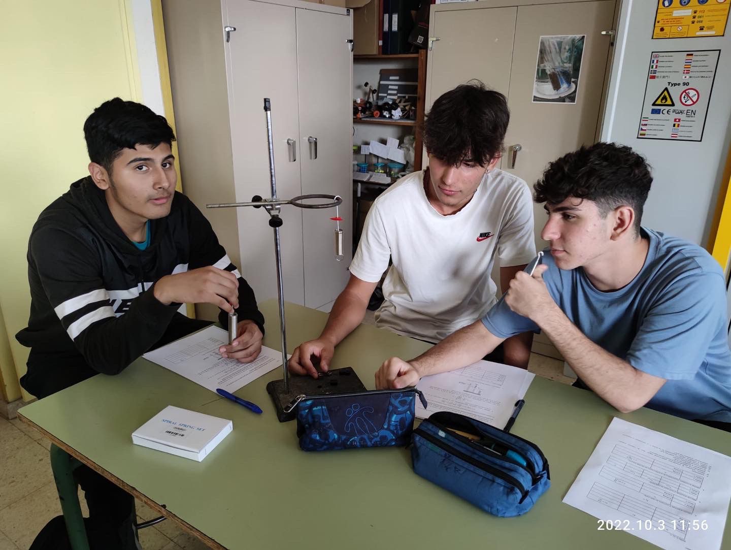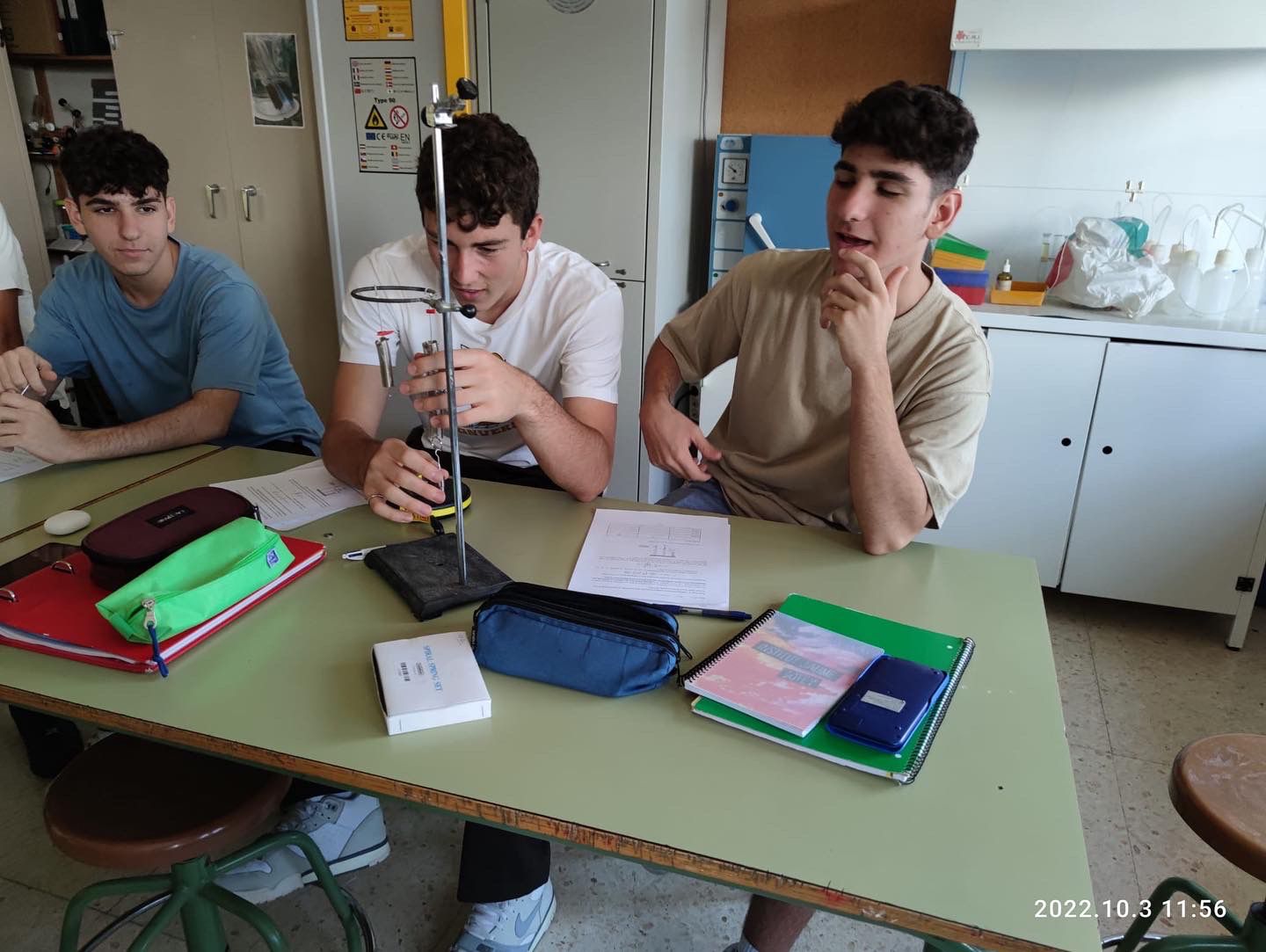 Els alumnes de reptes científics de FQ de 1r de batxillerat han realitzat la primera pràctica de l’assignatura, sobre la determinació experimental del període d’oscilació d’una massa penjada en una molla. Han pres unes mesures força bones i els resultats s’han aproximat bé als valors teòrics. Han fet una molt bona feina experimental!