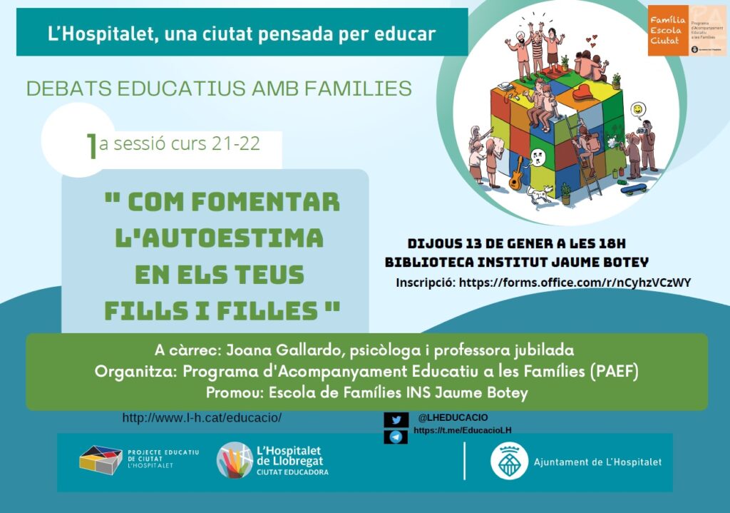 El dijous 13 de gener de 2022 a les 18.00 h tindrà lloc a la biblioteca del nostre institut la primera sessió del cicle de debats educatius que farem amb famílies aquest curs. En aquesta ocasió la sessió serà sobre “Com fomentar l’autoestima en els teus fills i filles“.