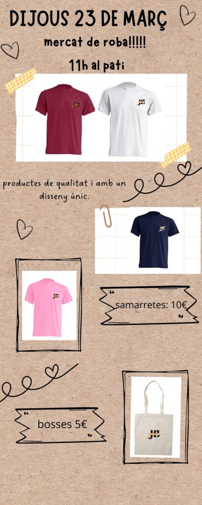 La venda es durà a terme aquest dijous 23 de març a l’hora del pati, al pati. El preu de la samarreta són 10€ i les bosses de 5€. Una part de l’import es destina a cobrir els costos de producció, l’altre al finançament de les activitats empresarials de la cooperativa i l’altre es destina a la fundació DAINA (https://fundaciodaina.org/), que treballa per protegir i millorar el benestar dels animals en situació d’abandó o maltractament.