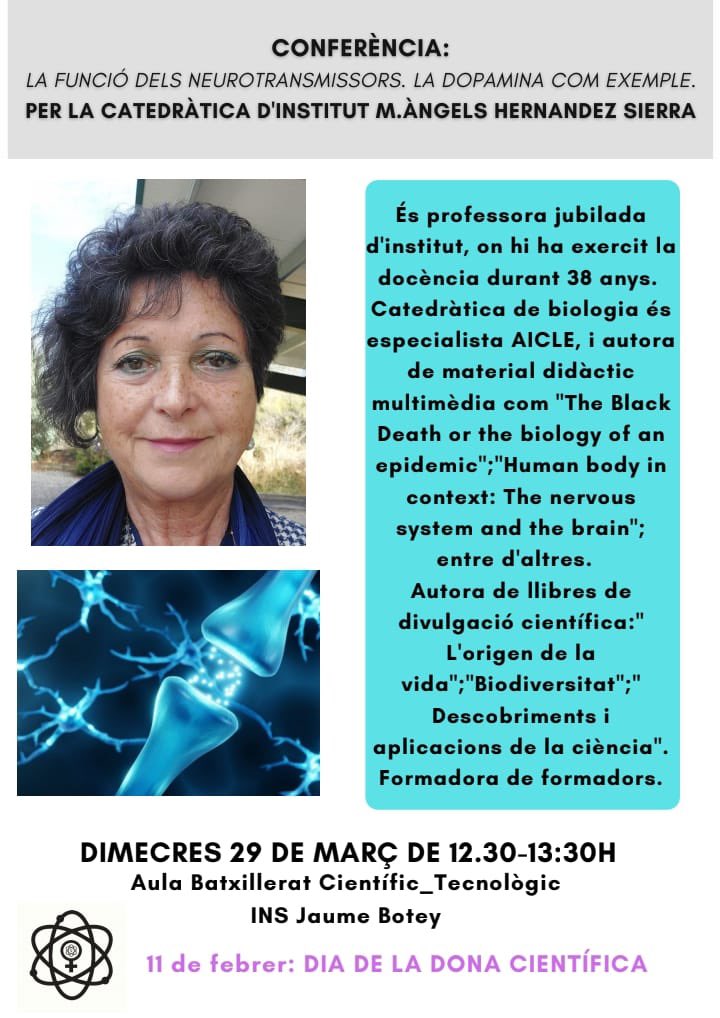 Avui ha vingut una professora de Biologia jubilada a fer una conferència que es titulava: La funció dels Transmissors. La Dopamina com a exemple. Carmen30/03/23 Hem estat alumnat de Batxillerat Científic-Tecnològic i alumnat de 4t dESO.