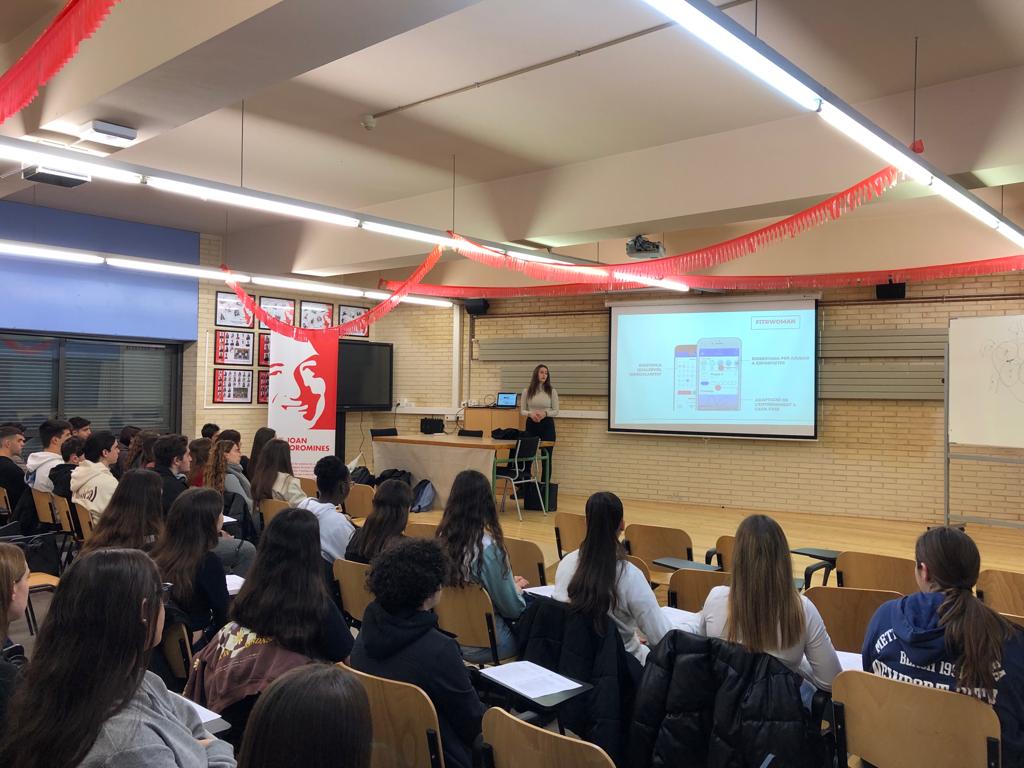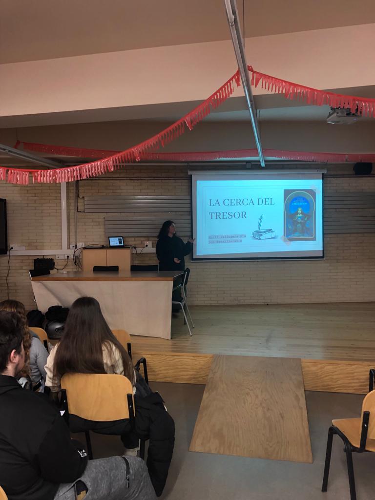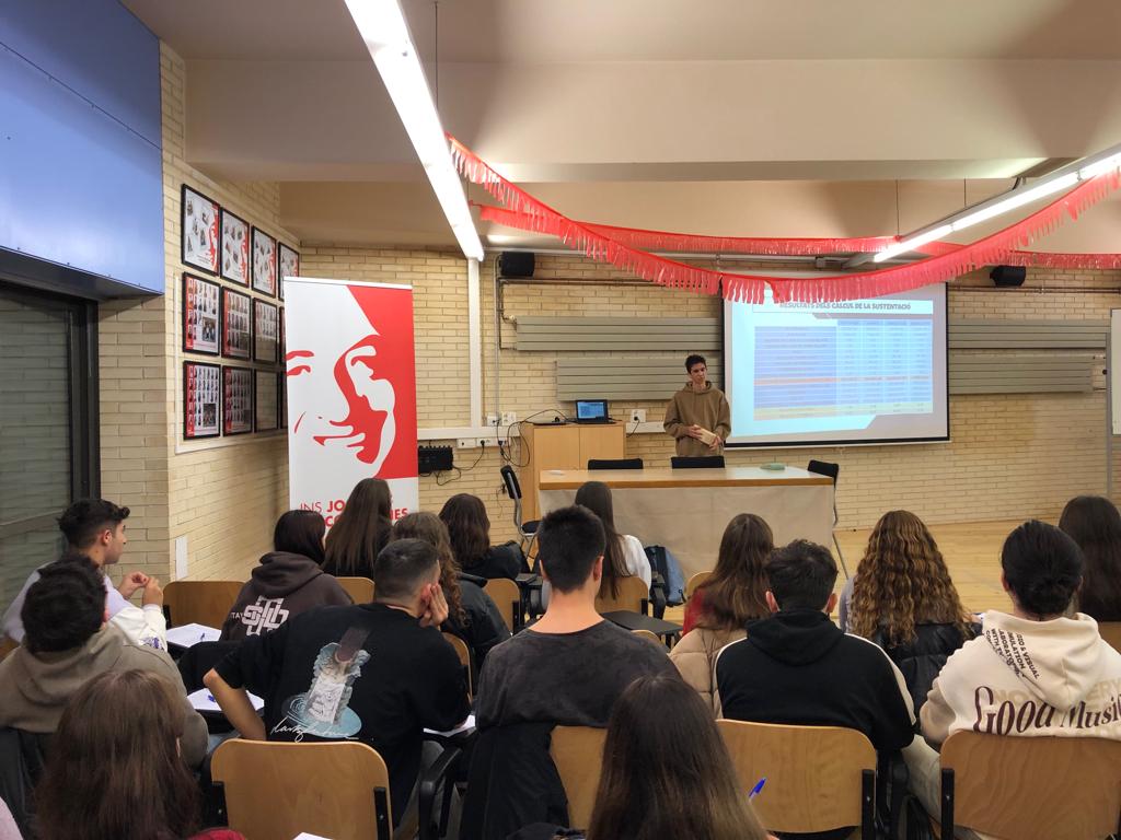Els quatre finalistes escollits pel professorat: l’Abril Vallugera (La recerca del tresor, “El secret”), l’Eva Sarrote (Donació i trasplantament d’òrgans i teixits), la Paula del Río (Com afecta la menstruació en l’alt rendiment esportiu) i l’Adrià Garcia (Aerodinàmica dels avions), van presentar els seus treballs a l’alumnat de 1r de batxillerat que feia de jurat.