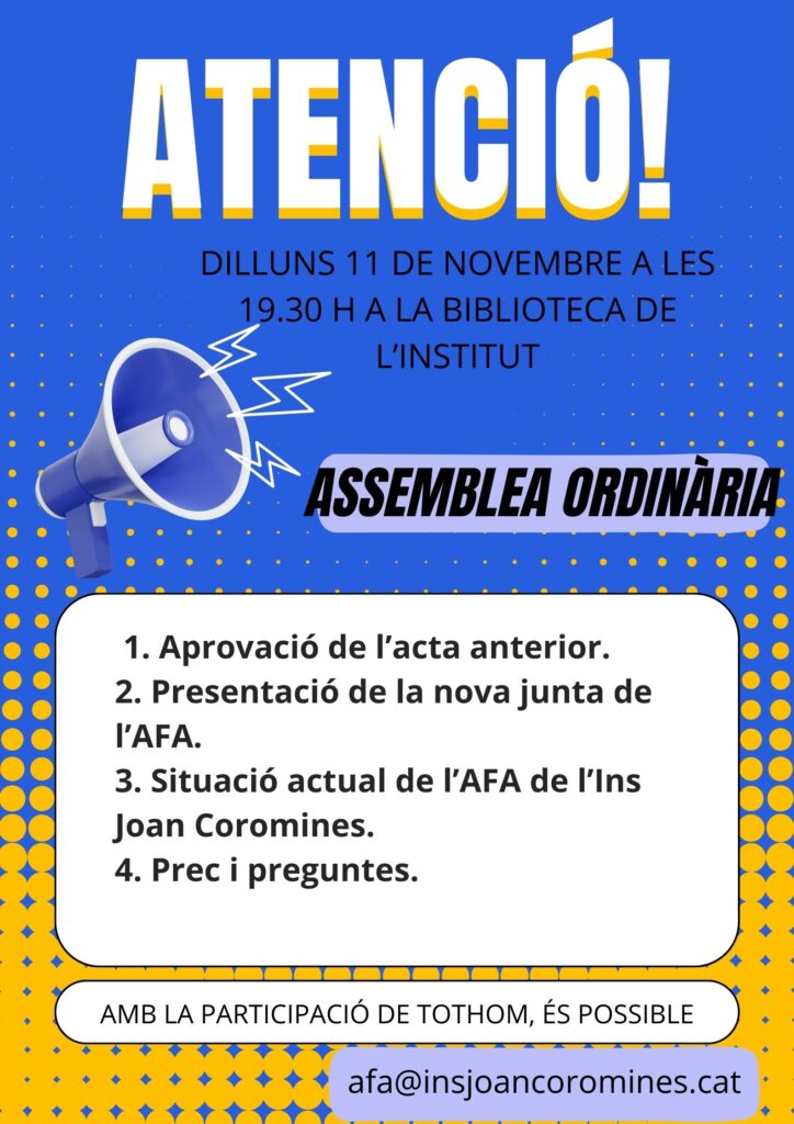 L’AFA és l’associació de famílies dels alumnes i mantenim una estreta col·laboració amb el Centre per vetllar pel benestar dels nostres fills i filles. Som una nova AFA amb ganes de donar suport a l’institut i ajudar-vos amb dubtes que pugueu tenir. Estem a la vostra disposició a través de l’e-mail afa@insjoancoromines.cat