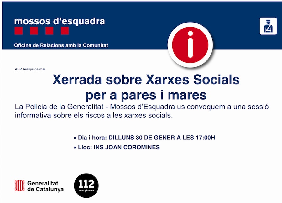 La Policia de la Generalitat – Mossos d’Esquadra us convoquem a una sessió informativa sobre els riscos a les xarxes socials.