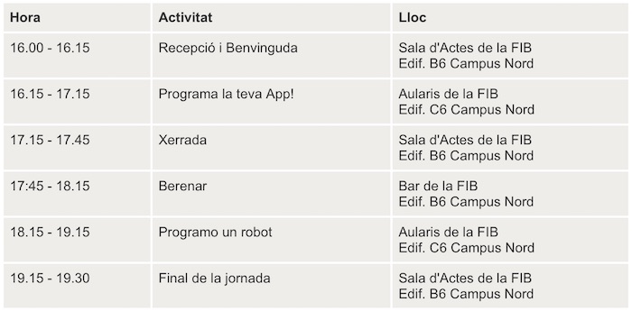 Aquestes activitats, orientades a noies de secundària i batxillerat, constaran d’un taller de programació d’aplicacions mòbils, una xerrada per part d’una reconeguda professional de les ICT i un taller de programació de robots.